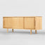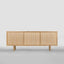 Say goodbye to clutter and hello to chic organization with our Nelson Sideboard in Natural, a stunning blend of Danish-inspired design and functional elegance. Crafted from solid wood, its sleek silhouette is accentuated by three textured reed rattan inlay sliding doors, offering easy access to ample storage space within. Whether adorning your dining room with dinnerware or organizing household items in your living area, this sideboard effortlessly combines style and practicality.