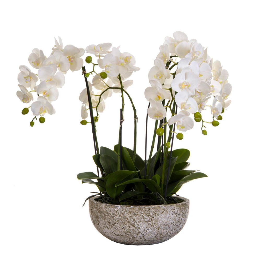 Indulge in the beauty of our Artificial Orchid in Round Clay Pot, measuring 62cm in height and adorned with pristine white blooms and verdant green buds. Its slender stems and exposed roots intertwine with lush, dark green leaves, creating an air of refined sophistication. This exquisite arrangement is perfect for adding a touch of elegance to any space, whether it's a sunlit window sill, chic coffee table, or corporate office. Made with high-quality plastic, wire, and a clay pot, this faux orchid promises to elevate your home decor with its timeless charm.