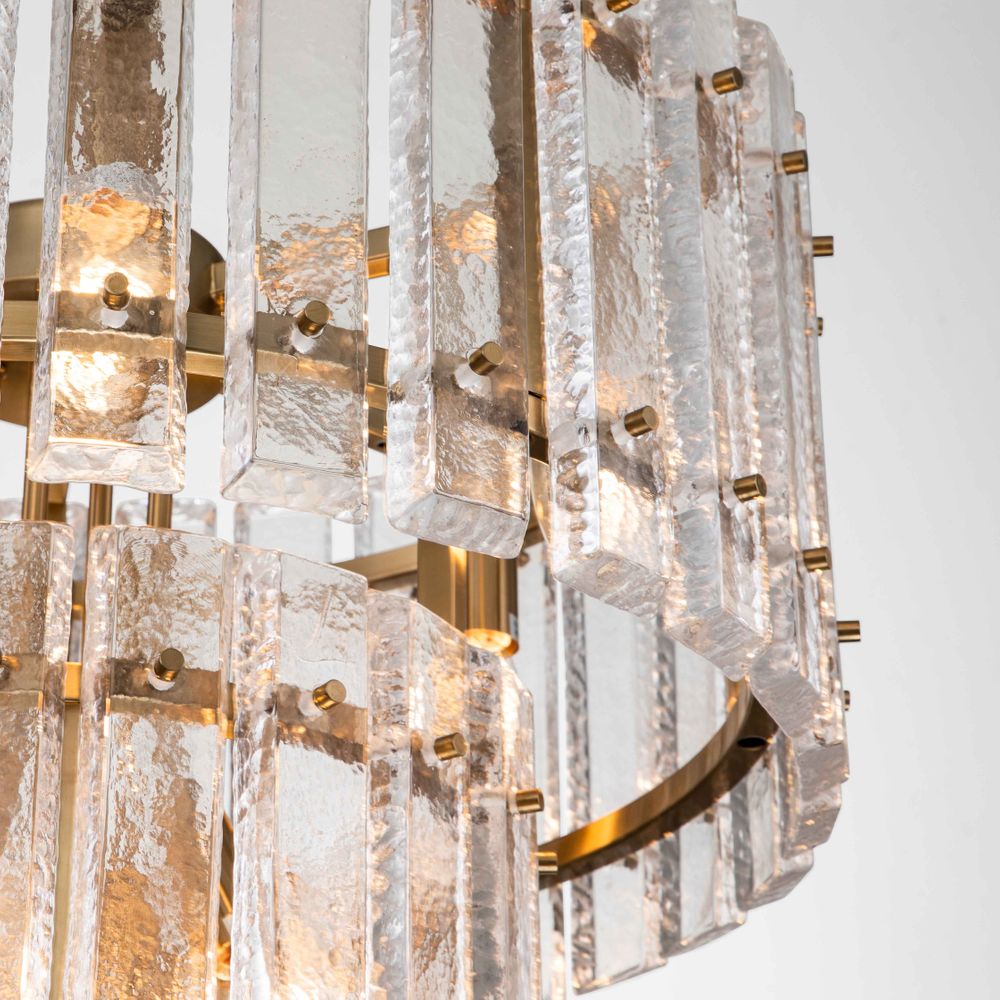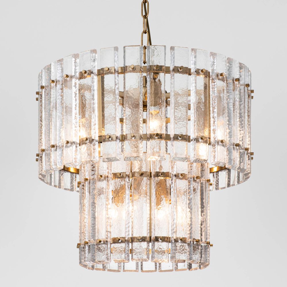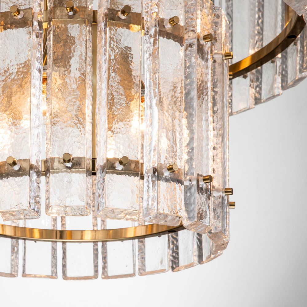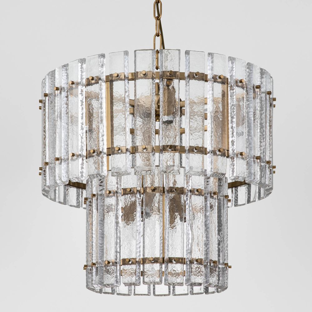 Introducing the Fenton Chandelier, a stunning addition to any space that exudes sophistication and modern allure. This two-tiered masterpiece features a brass-finished iron frame adorned with textured clear crystals, creating a mesmerizing glow that transforms any room into a captivating sanctuary. Whether suspended in a living room or gracing hotel lobbies and commercial spaces, this luminary adds a touch of elegance and grandeur to every setting it adorns.