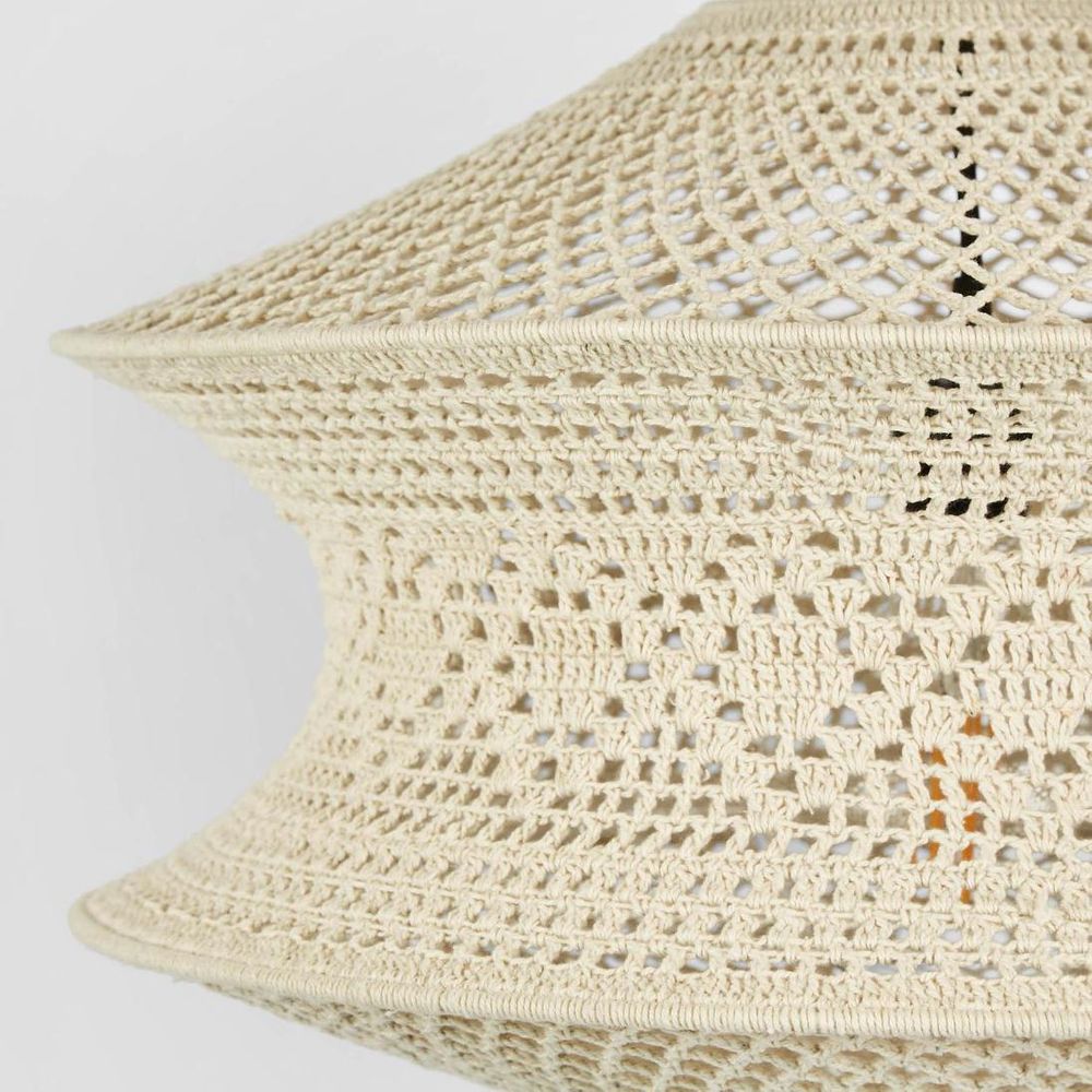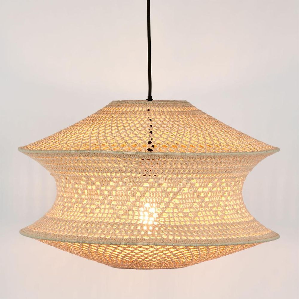 Add a twist of elegance to your decor with our Large Summersby Ceiling Pendant in Ivory. Crafted with exquisite detail, this pendant features a beautifully crocheted design delicately woven around a sturdy iron frame. Its neutral color palette and intricate crochet work evoke a sense of serenity and calm, transforming any space into a sanctuary of tranquility. From the comfort of your living room or bedroom to the cozy ambiance of cafes, let this pendant weave its charm and elevate every moment with its understated sophistication and unique character.