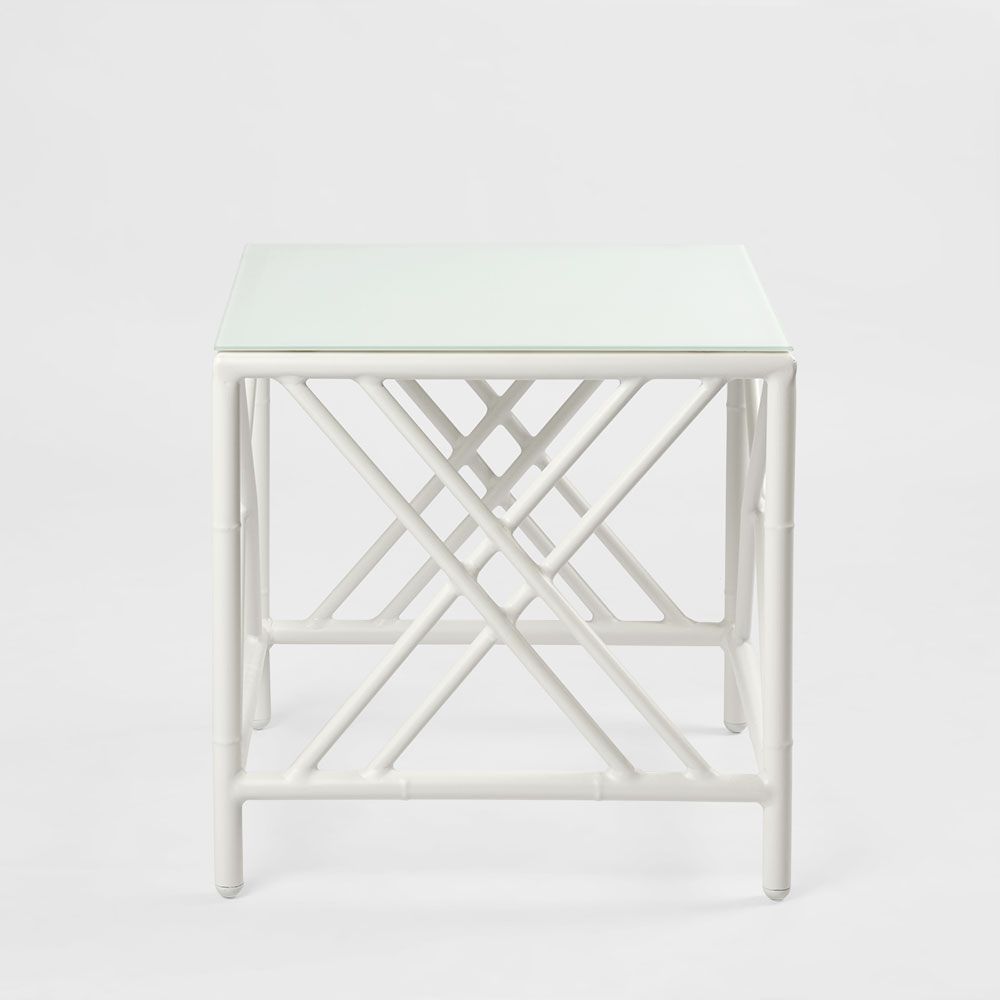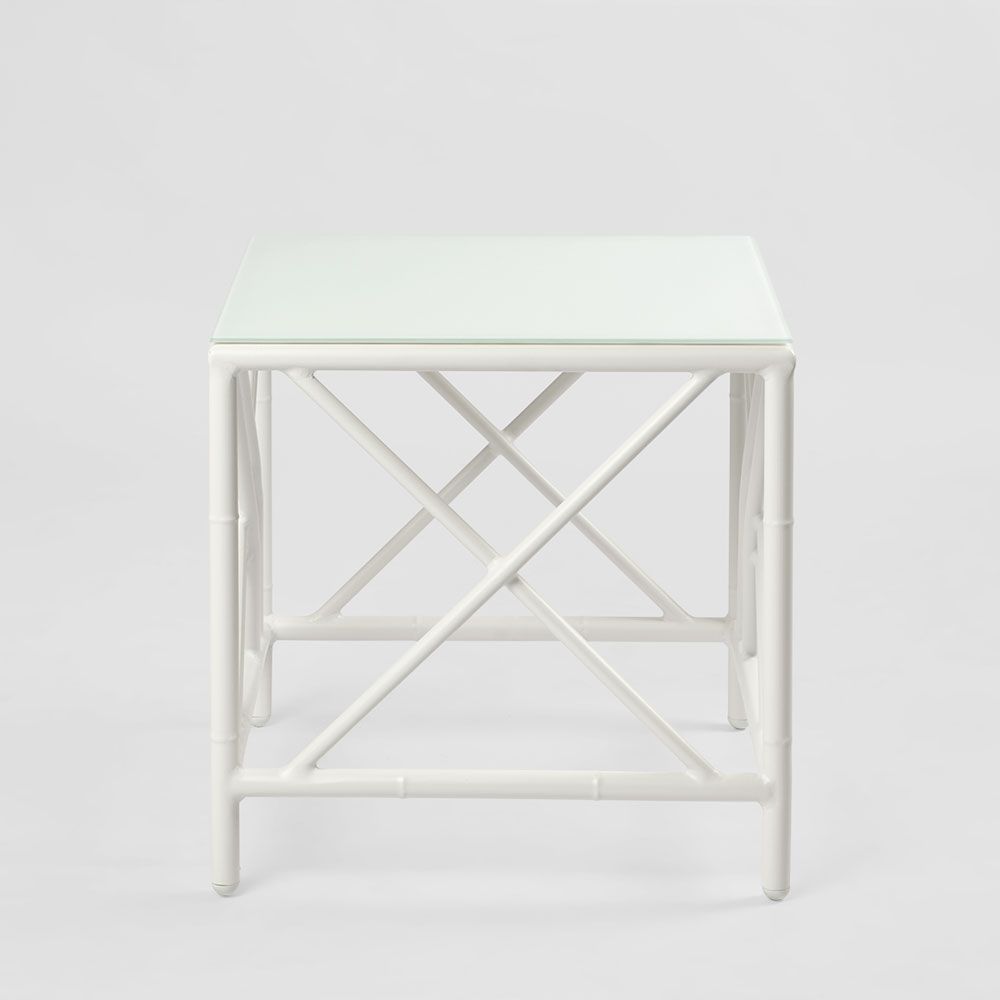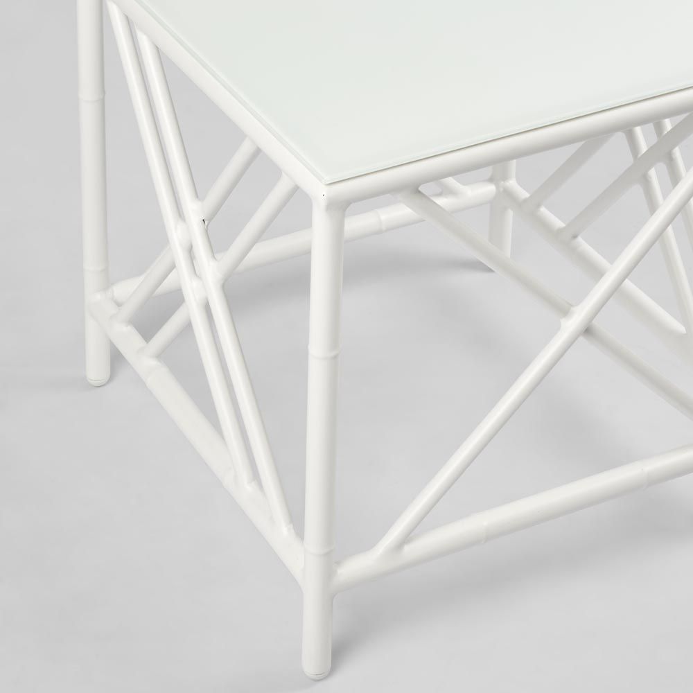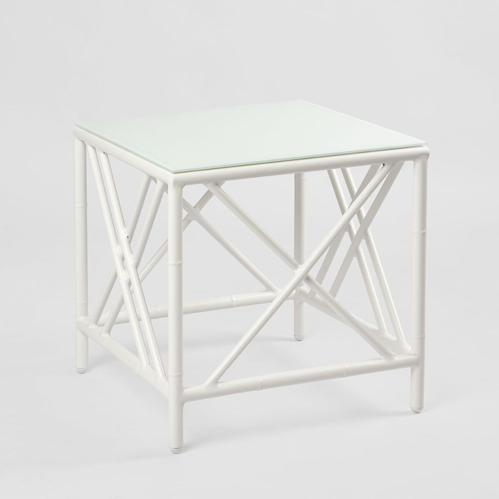 The Elodie Outdoor Side Table in powder coated aluminium features an attractive lattice pattern with bamboo like embellishments. The frosted tempered glass top is the perfect ledge to sit your beverage & book.