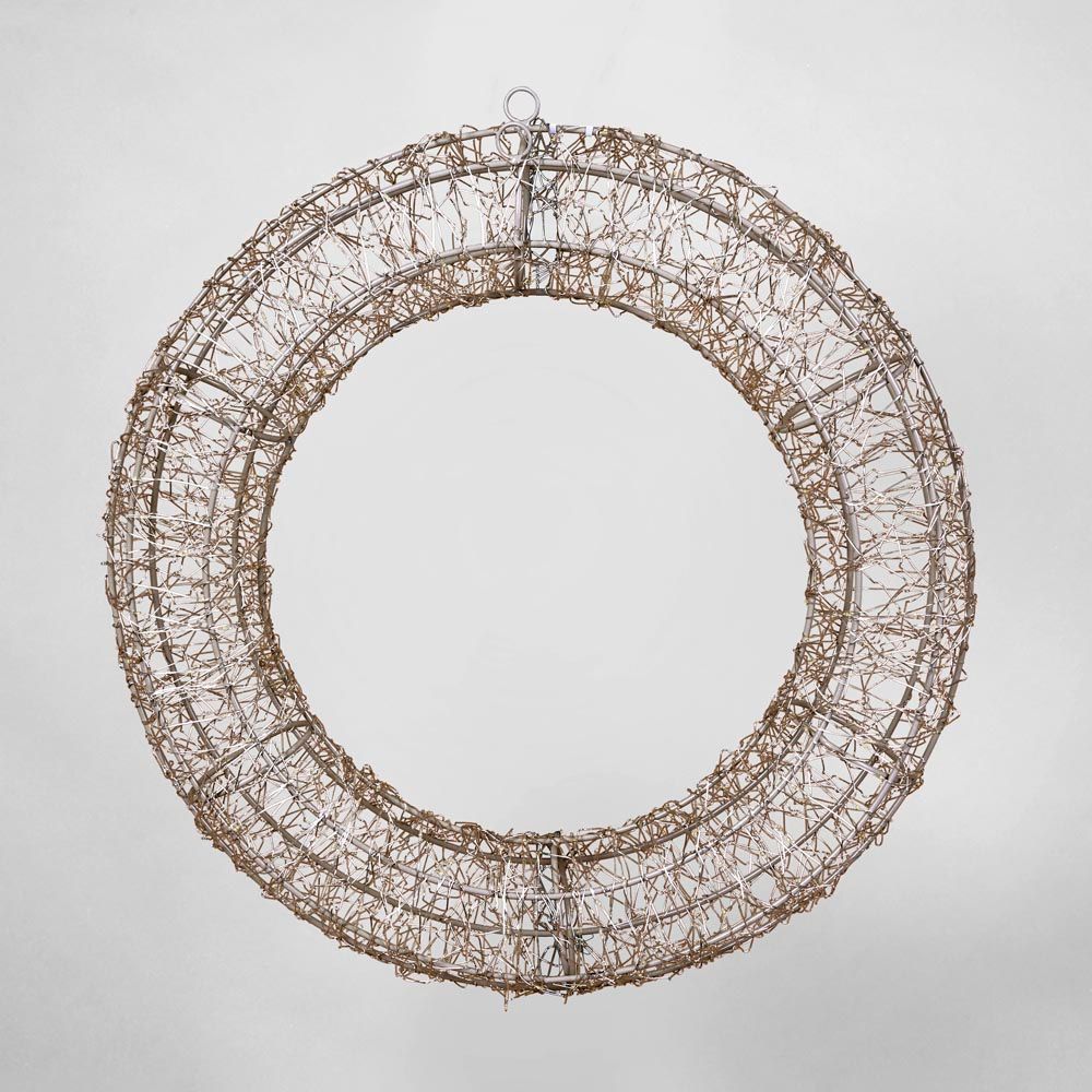 Material : GOLD METAL WIRE ring 70x15x70m+1440L with timer 6HR on 18HR off micro LED lights, Light distance 5cm, lead wire 5M ,IP44 transformer 24v 6w packing 1 pc 1 white box +color label 71X16X71cm