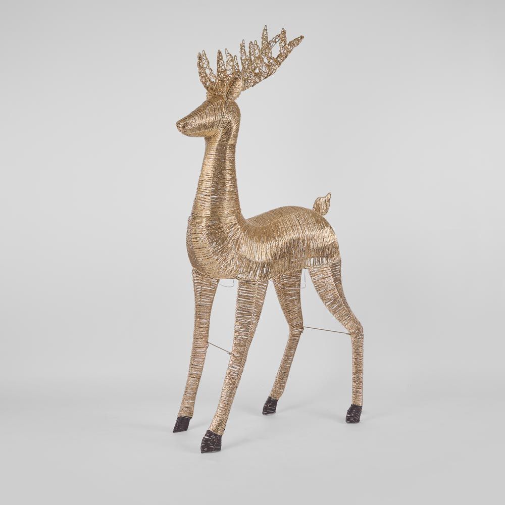 Material : Paper gold farther reindeer 90x27x190cm + 185L with timer 6HR on 18HR off warm white LED lights, Light distance 10cm, lead wire 5M ,IP20 transfomer 24V 6W packing brown outer directly