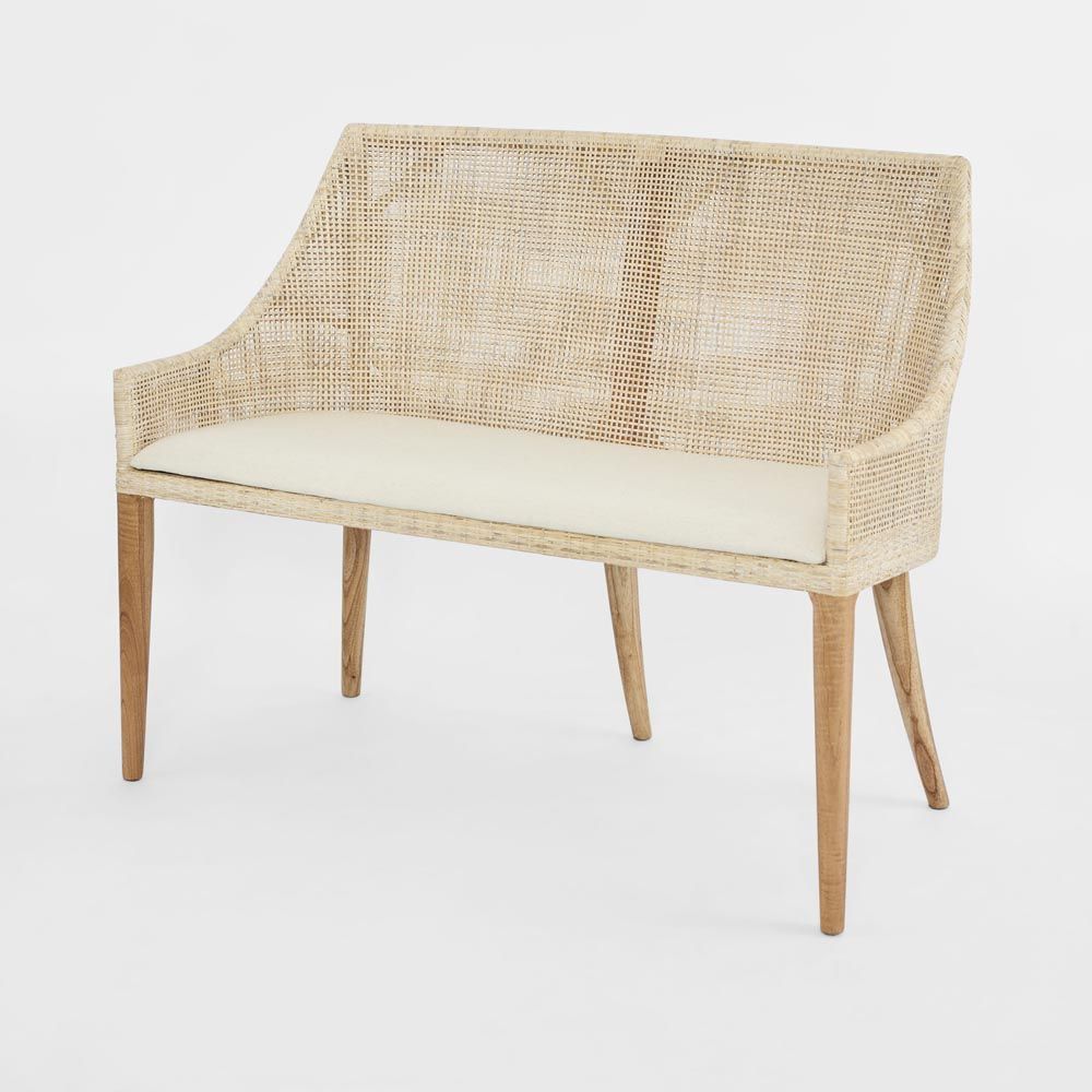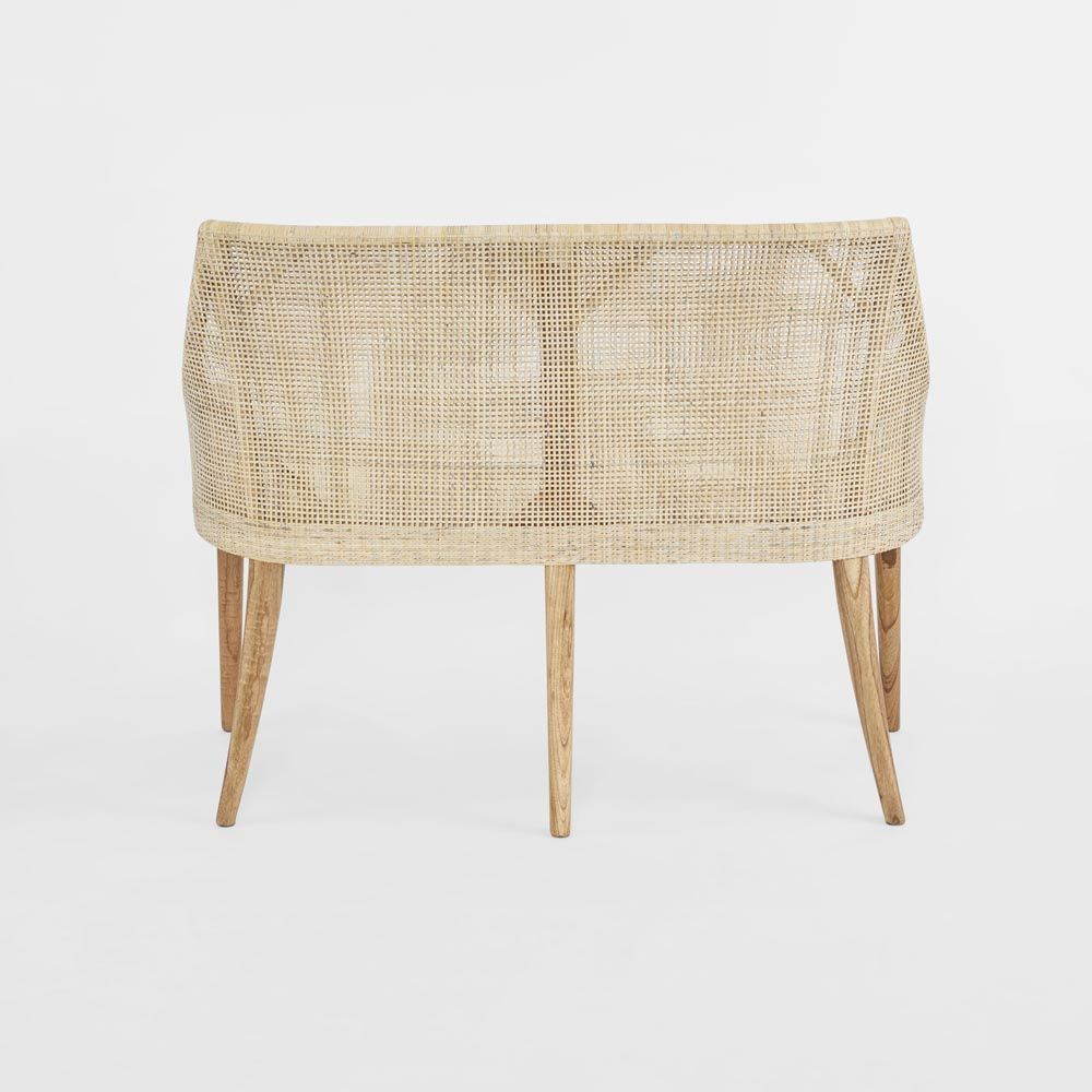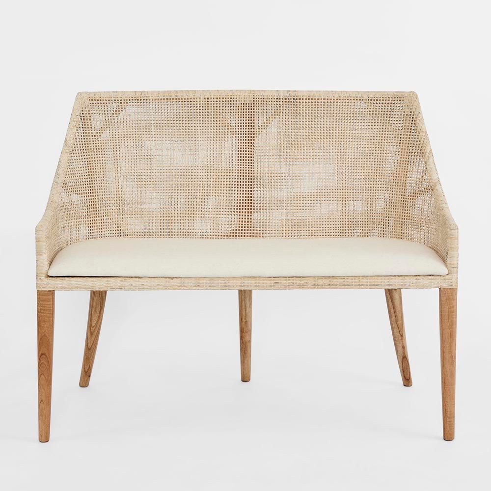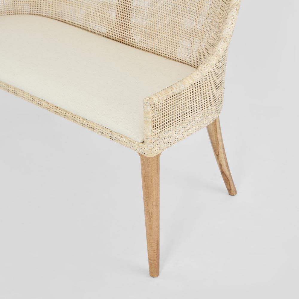 Hand woven rattan, mindi wood legs, removable upholstered seat cushion Please note: Rattan is not designed for full outdoor use. If placed outdoors or even in covered outdoor areas, it may weather, fade, or change over time due to exposure to sunlight and moisture. We recommend indoor use or placing it in well-protected areas.