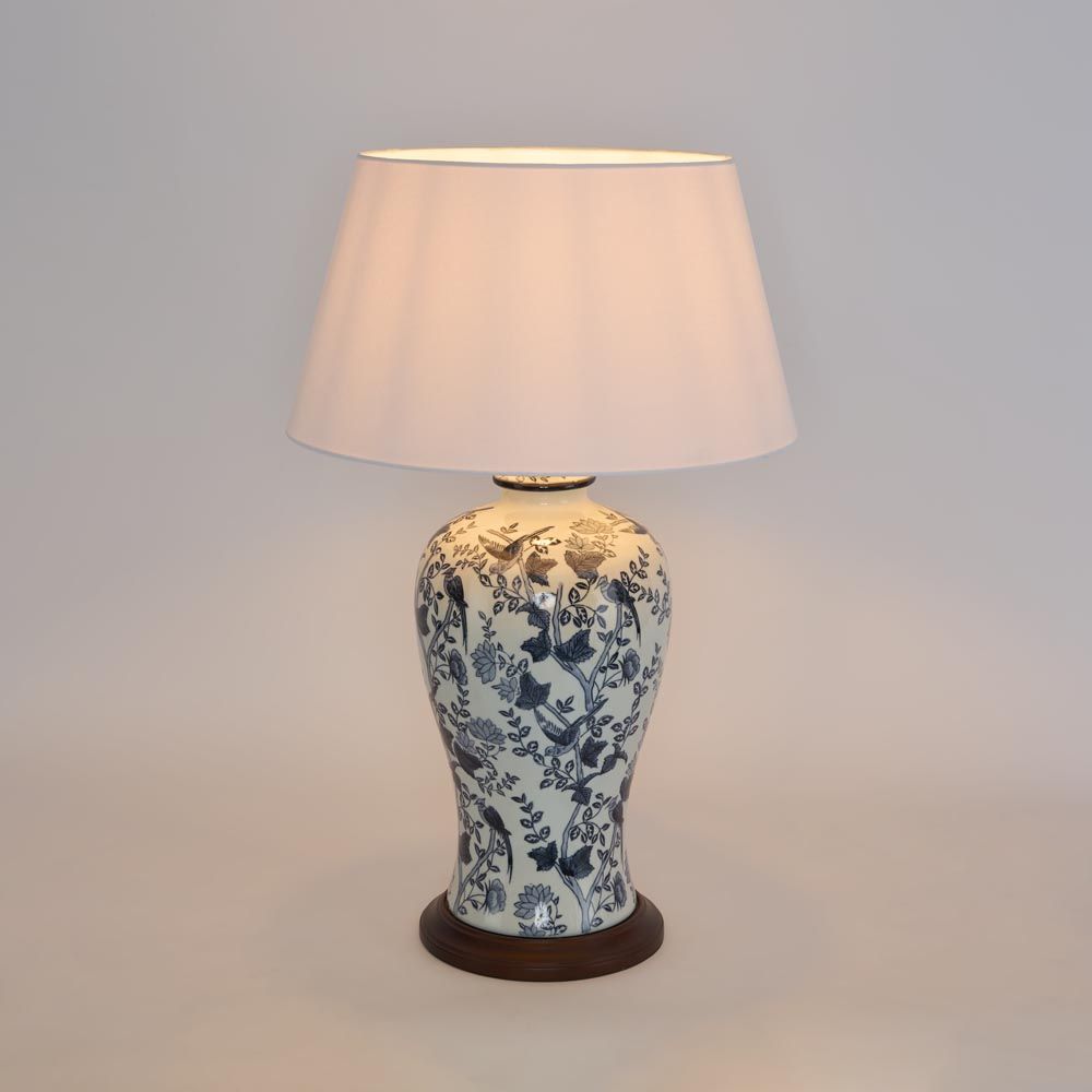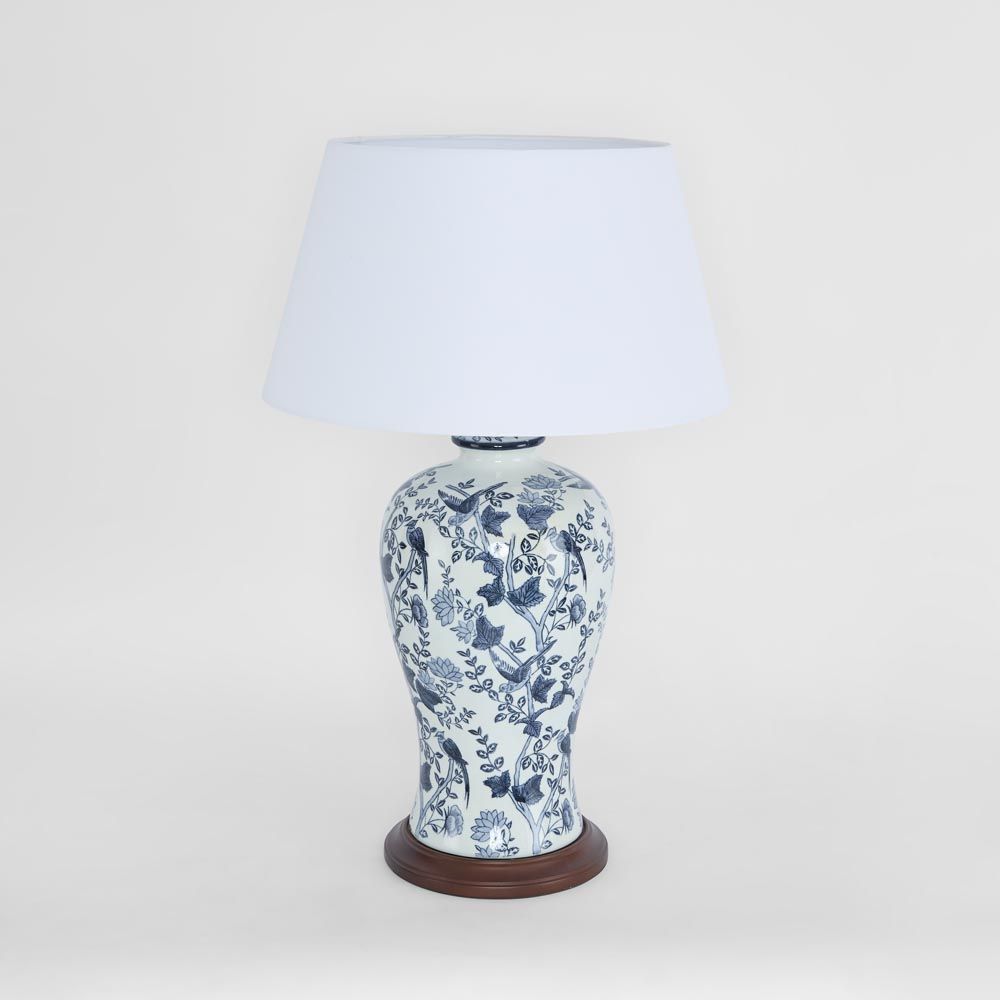 Our Ashleigh is charming oriental ceramic base table lamp that sits on brown timber base and has classic ginger jar style. The lamp is delicately hand painted with bird and leaf motif on ivory white background. This is elegant lighting for traditional interiors with blue and white colour and perfect to sit on console table in living or family room.