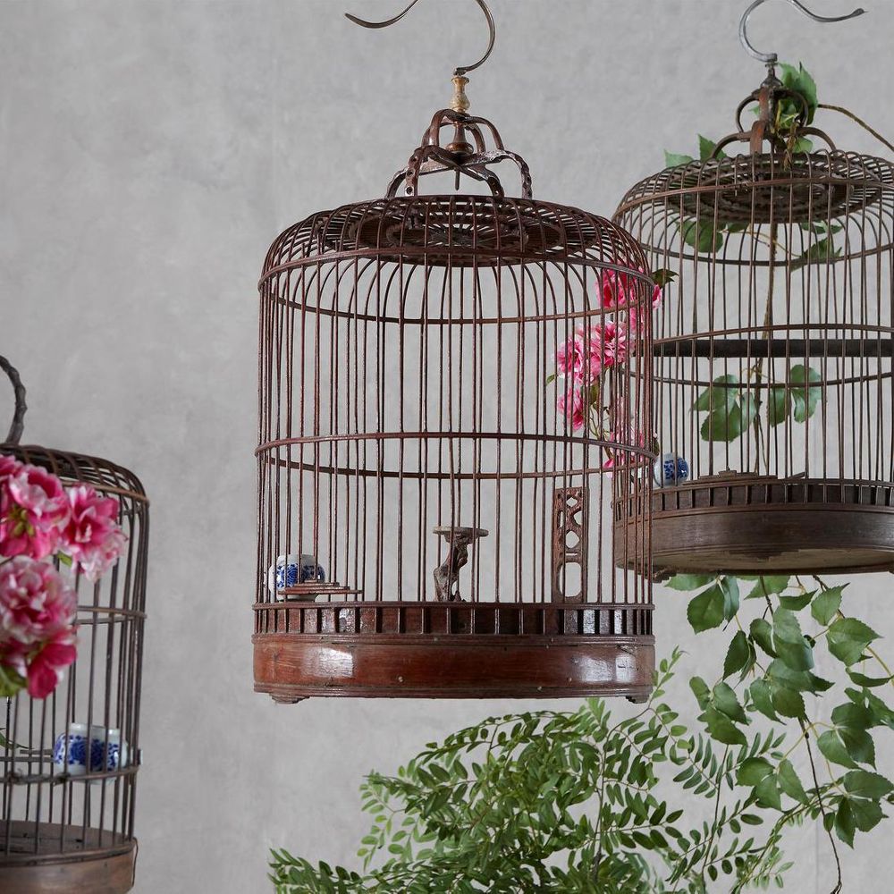 Beautiful and still very functional, these bamboo birdcages collected from around the sprawling capital of China are unique in design, size and finish. Featuring traditional blue and white Chinese porcelain food and water bowls and iron finials and hooks, they are an exquisite addition to any interior setting.