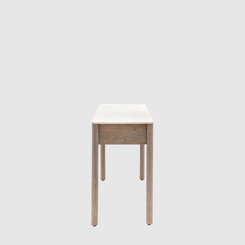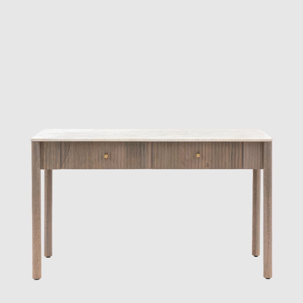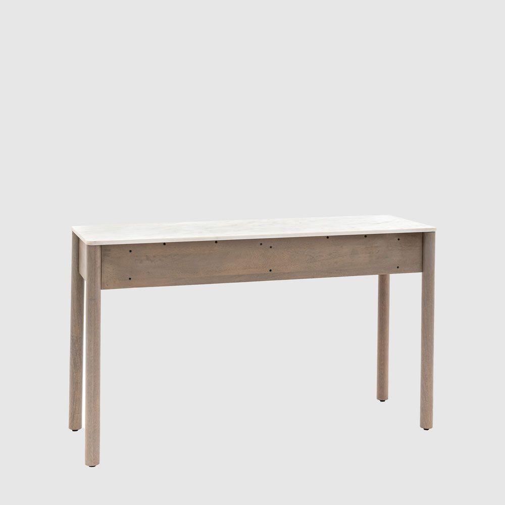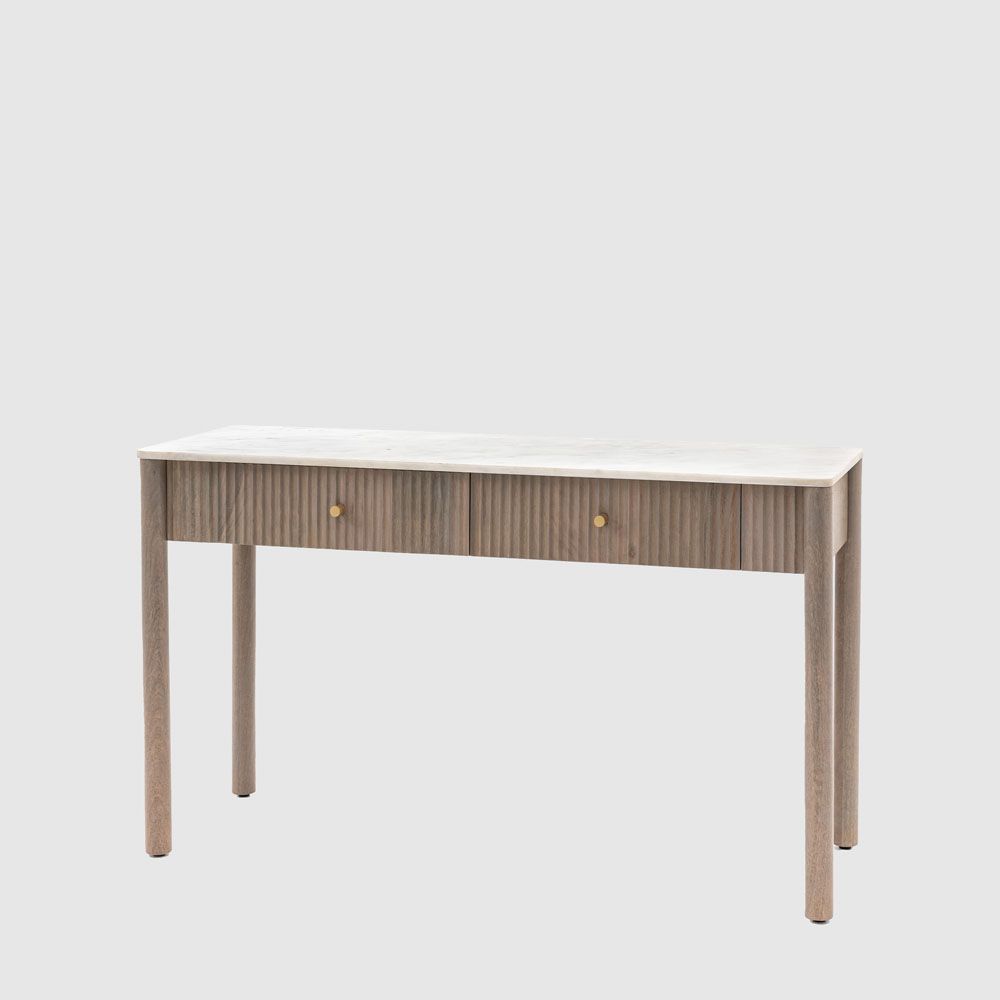 This on trend console table offers a modern classic look. Crafted from solid mango wood, with a striking vertical ribbed feature on the drawers, and a polished Indian white Carrera marble top with classic grey/blue veins running through it, the table exudes timeless quality & beauty. Matching pieces are available.