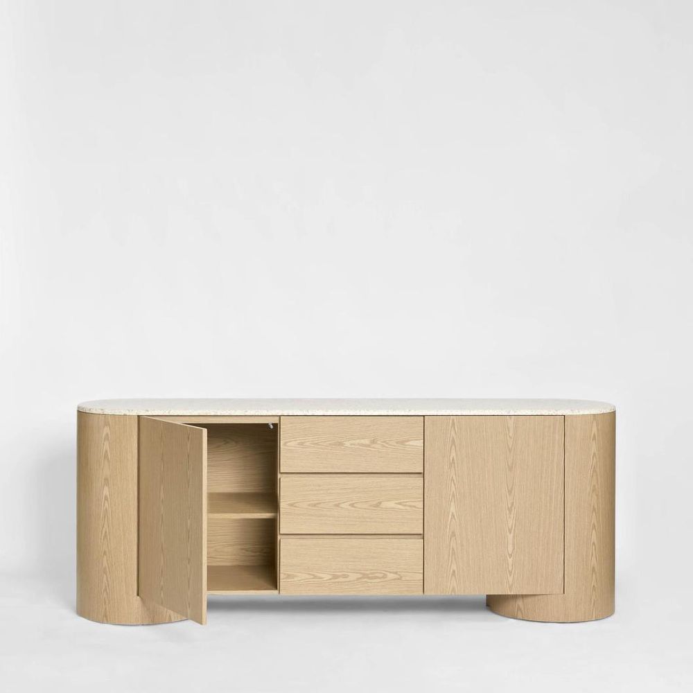 Arlo Sideboard featuring a terrazzo stone top over smooth cylindrical oak forms. Thoughtfully designed with central drawers and concealed cabinetry for ample storage, this piece blends organic texture with contemporary craftsmanship. The soft curves and seamless joinery create a sculptural, high-end aesthetic.