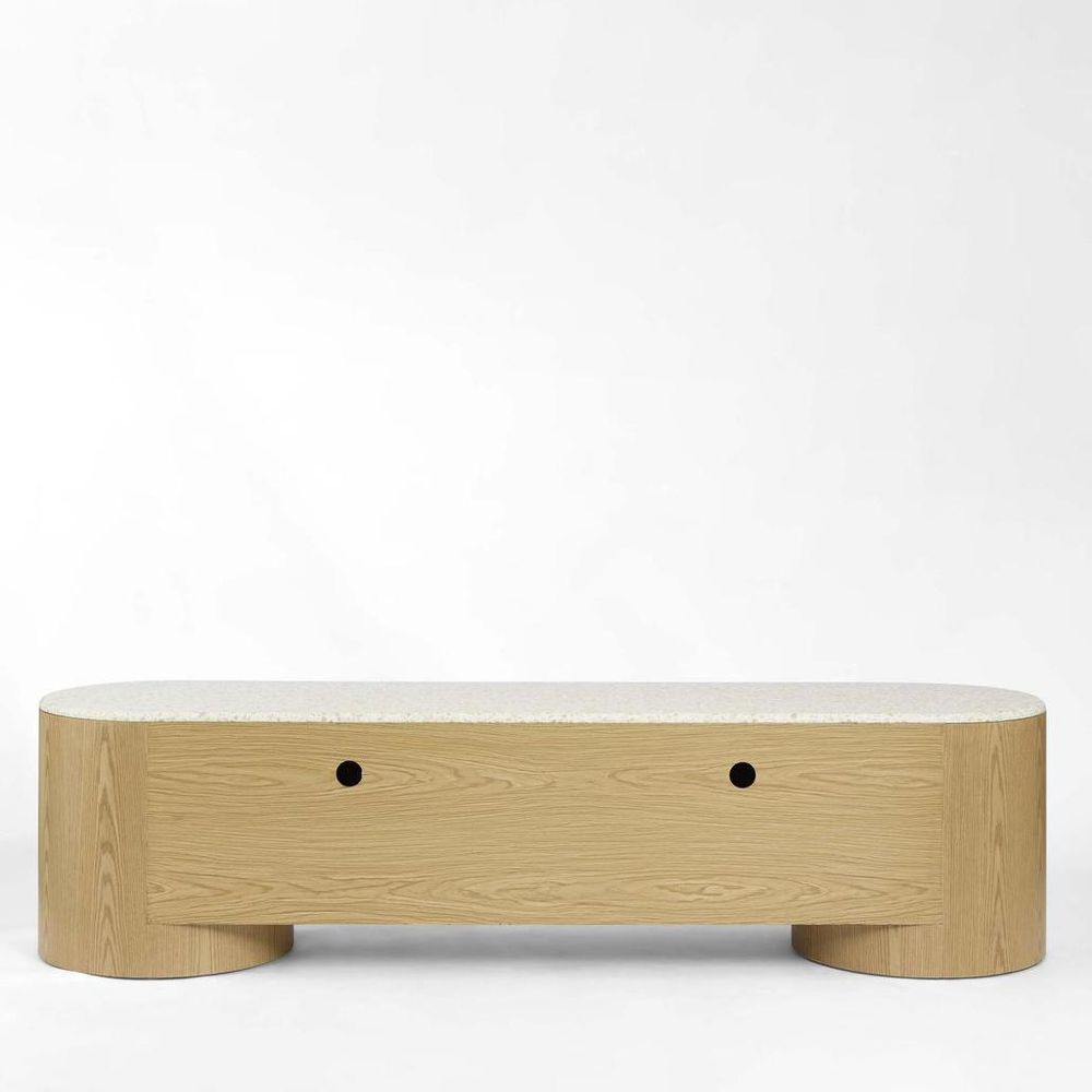 Arlo Entertainment Unit featuring smooth cylindrical ends, a terrazzo stone top, and natural oak veneer cabinetry. With concealed push to open doors and internal shelving, this piece blends practical storage with architectural form. The combination of materials and curves creates a statement of refined contemporary design.