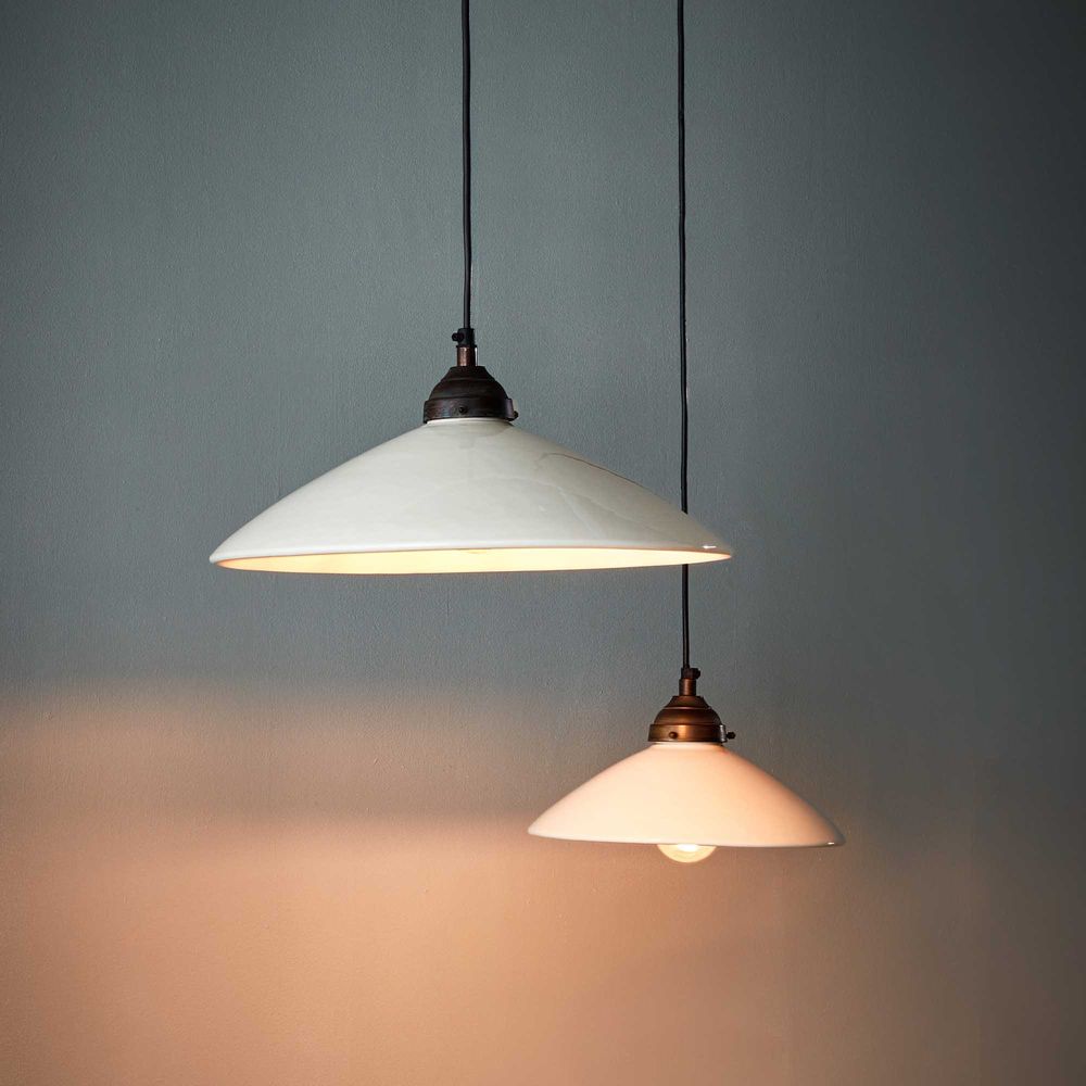 Our Newport is a simple and elegant ceramic hanging dish lamp, designed to complement and contribute to the overall aesthetics of your home or workplace. The lamp features classic design elements such as the ceramic shade and antique silver top fitting with matching cup ceiling rose. It is perfect to be installed on top of a kitchen island or dining table. The shade comes in a beautiful off-white/cream color and is available in two sizes: small and large.