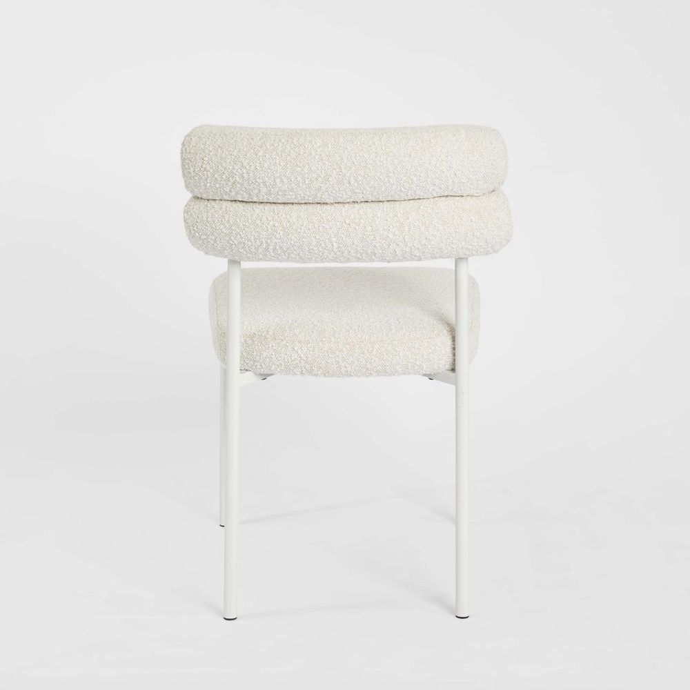 Effortlessly chic and playfully modern, the Ariana Dining Chair blends soft texture with clean, contemporary lines. Upholstered in a plush off-white boucle fabric, the chair’s rounded double roll-backrest design offers a subtle nod to mid-century styling while maintaining a fresh, minimalist appeal. The powder-coated metal frame in matching white provides a sleek contrast to the tactile upholstery, creating a light, airy presence perfect for modern dining or studio spaces. Minimum order quantity 2pcs Backrest Height: 34cm