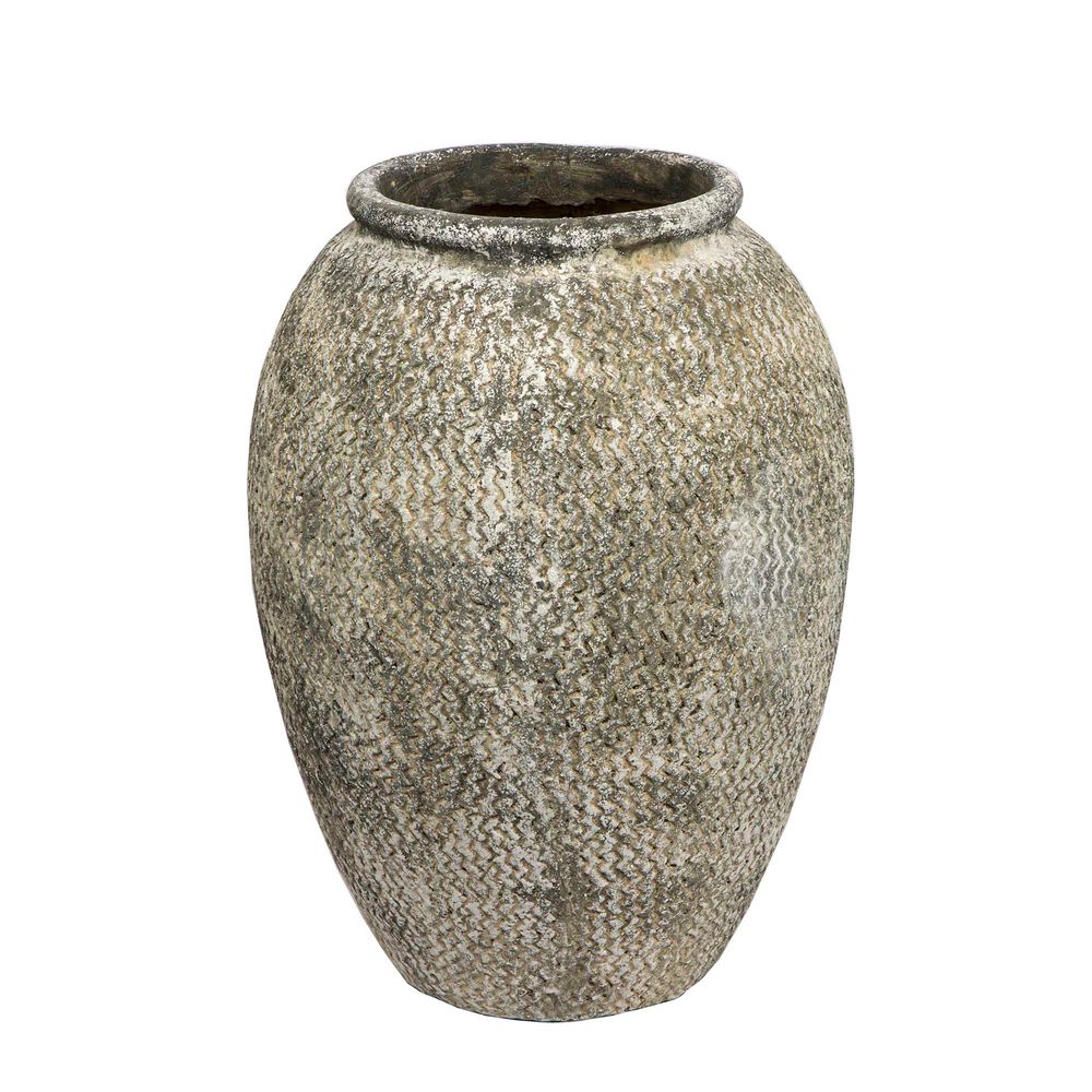 The Small Baxter Planter boasts a unique zigzag etched pattern that adds a touch of intrigue to any space. Its urn shape, and vintage-inspired design, complete with a distressed and weathered appearance, evokes the rustic allure of bygone eras, making it a perfect addition to both indoor and outdoor settings. Whether it's gracing your garden patio or adorning your foyer, the Baxter Planter promises to be a conversation starter wherever it's placed.