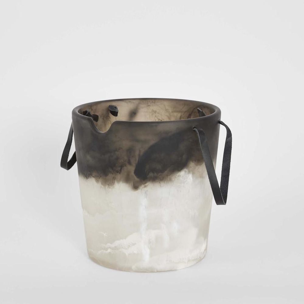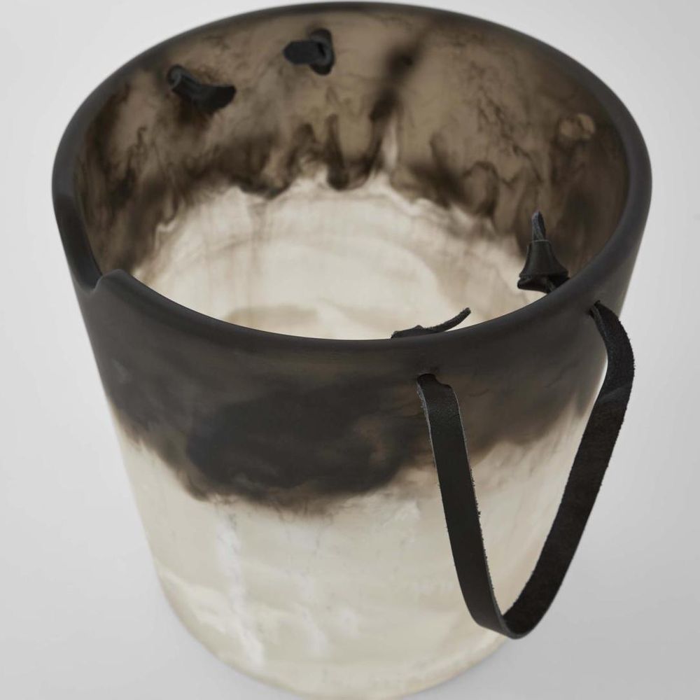 Handcrafted from resin, this ice bucket blends has leather handles, smooth curves with a luminous finish.