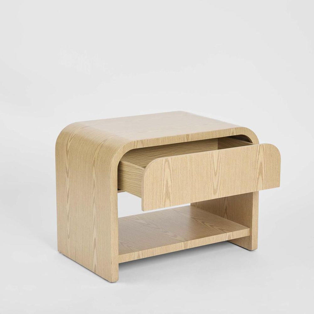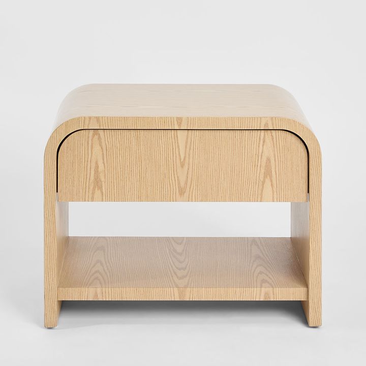 A sculptural bedside table crafted in natural oak veneer, featuring a smooth continuous curve that forms both the frame and top. The design includes a single drawer and open shelf, combining elegant form with practical function. Its soft edges and natural grain bring a sense of calm, organic minimalism to any interior.Floor clearance: 6cm