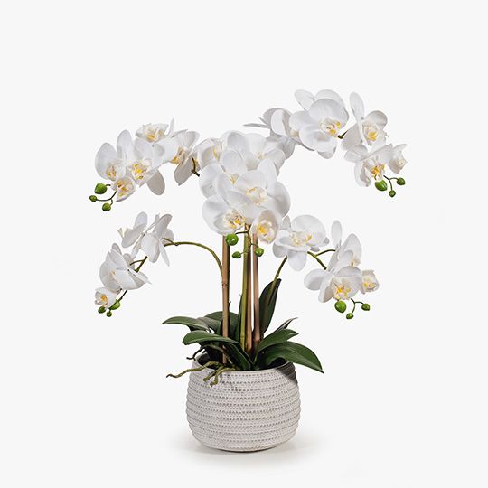 This artificial arrangement features its own stylish clay pot, ready to be styled in any space. This artificial orchid phalaenopsis in pot is in our Fresh Touch' range which means the flower petals and leaves have a realistic soft "feel", almost natural.