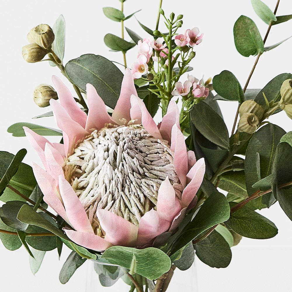 This artificial arrangement is handcrafted using premium quality materials set in clear resin (artificial water). This outstanding protea king mix in vase will make a bold statement piece in any area of your home or office. The amazingly detailed king protea help create an interesting and impressive faux floral display mixed with eucalyptus spinning gum this arrangement is incredibly realistic. Being artificial, this arrangement is easy to care for and easy to style any interior. Keep out of direct sunlight for long lasting beauty. Note: Artificial stems used in this arrangement may also be available to be purchased separately to create your own arrangement from our extensive range of artificial flowers.