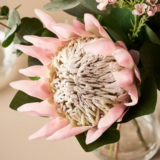 This artificial arrangement is handcrafted using premium quality materials set in clear resin (artificial water). This outstanding protea king mix in vase will make a bold statement piece in any area of your home or office. The amazingly detailed king protea help create an interesting and impressive faux floral display mixed with eucalyptus spinning gum this arrangement is incredibly realistic. Being artificial, this arrangement is easy to care for and easy to style any interior. Keep out of direct sunlight for long lasting beauty. Note: Artificial stems used in this arrangement may also be available to be purchased separately to create your own arrangement from our extensive range of artificial flowers.