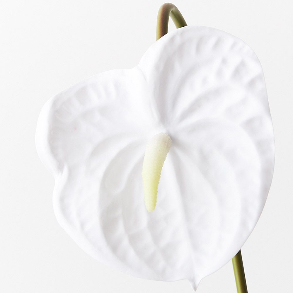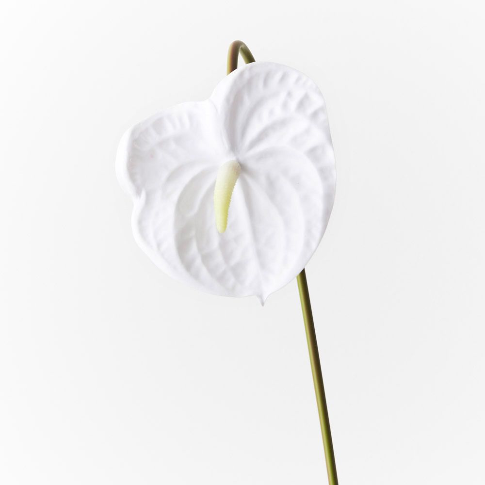 Bring a dash of colour to your interior space with this gorgeous faux Anthurium in winter white. Easily maintained this realistic artificial flower stem will bring lasting beauty into your home. Create a one of a kind artificial arrangement mixing with other stems or place in a decorative vase on its own. For longer lasting faux flower stems keep out of direct sunlight.