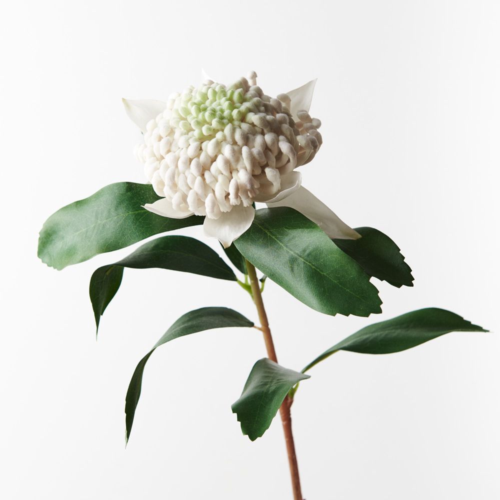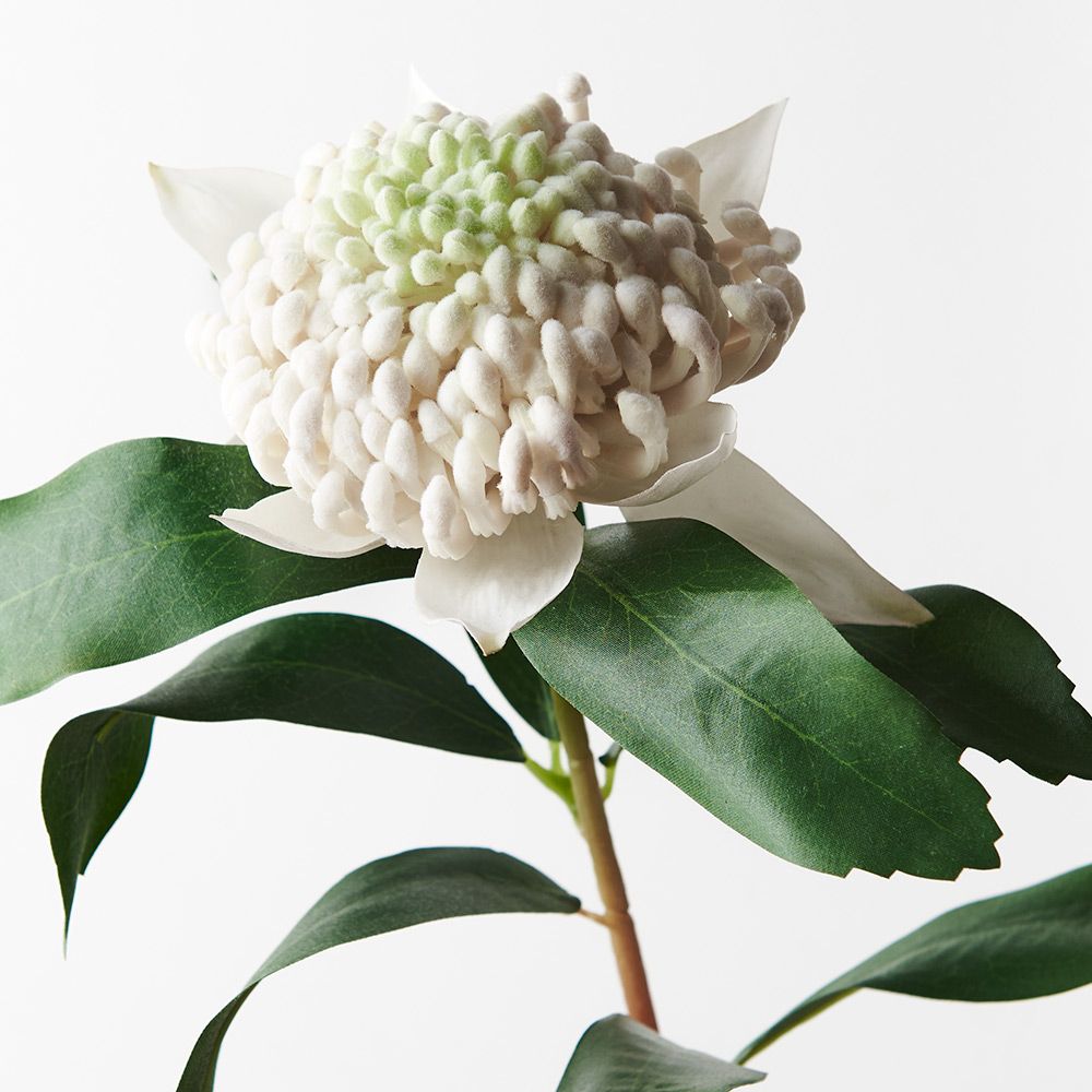 The artificial natives in the floral interiors range are amazingly life-like, this Waratah in white is no exception. The fine details and colours are amazing, so true to life that it is difficult to note the difference. The faux Waratah can easily be styled in a vase on its own or mixed with other artificail stems from our large range. You can enjoy long lasting beauty with these faux waratah stems, be sure to keep out of direct sunlight.
