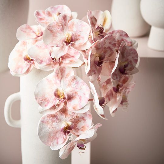Bring a dash of colour to your interior space with this gorgeous faux Orchid Phalaenopsis Infused stem in Pink Mauve. Easily maintained this incredibly realistic artificial flower stem will bring lasting beauty into your home. Create a one of a kind artificial arrangement mixing with other stems or place in a decorative vase on its own. For longer lasting faux flower stems keep out of direct sunlight. This artificial Orchid Phalaenopsis is in our ‘Fresh Touch’ range which means the flower petals and heads have a realistic soft "feel", almost natural.