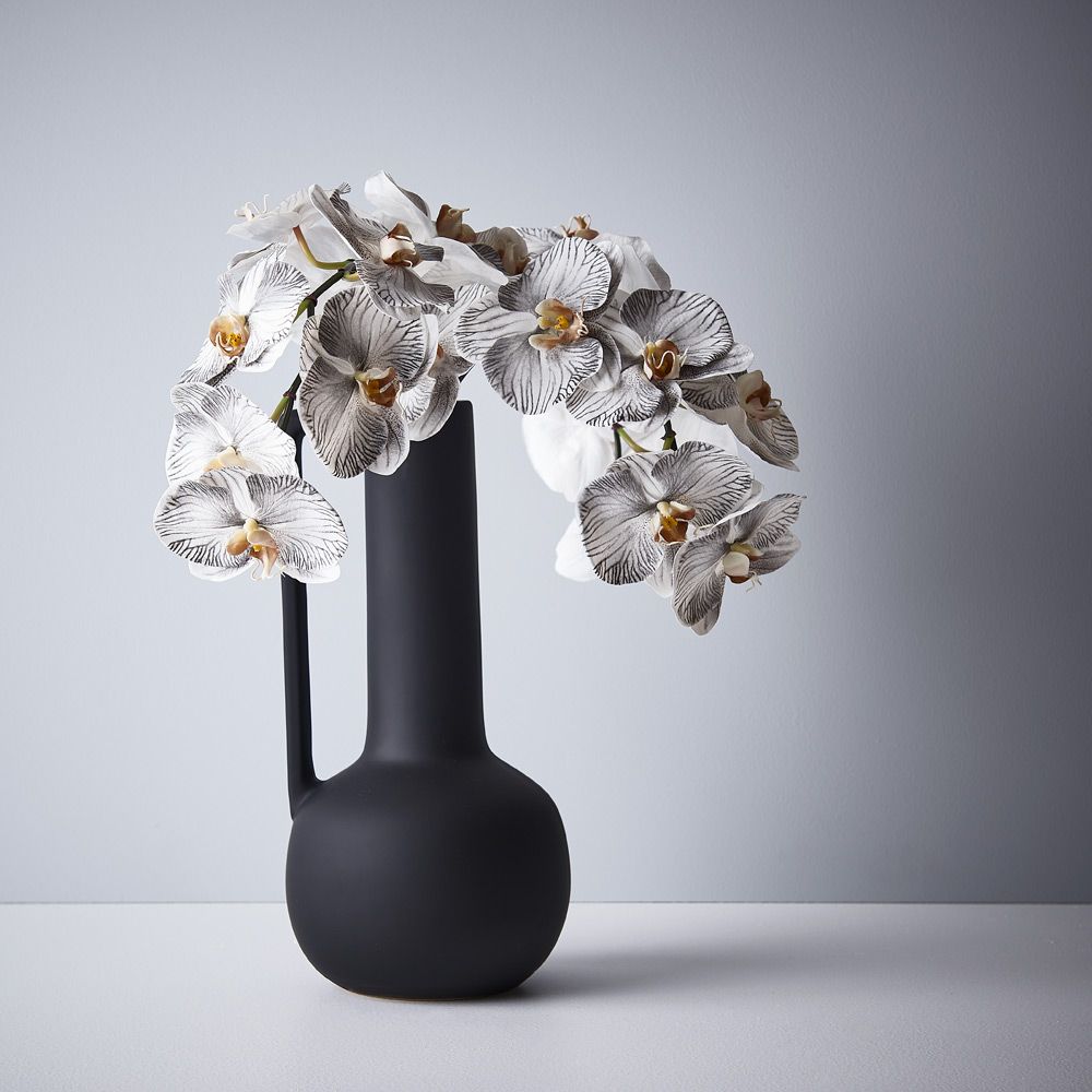 Bring a dash of colour to your interior space with this gorgeous faux Orchid Phalaenopsis Infused stem in White Black. Easily maintained this incredibly realistic artificial flower stem will bring lasting beauty into your home. Create a one of a kind artificial arrangement mixing with other stems or place in a decorative vase on its own. For longer lasting faux flower stems keep out of direct sunlight. This artificial Orchid Phalaenopsis is in our ‘Fresh Touch’ range which means the flower petals and heads have a realistic soft "feel", almost natural.