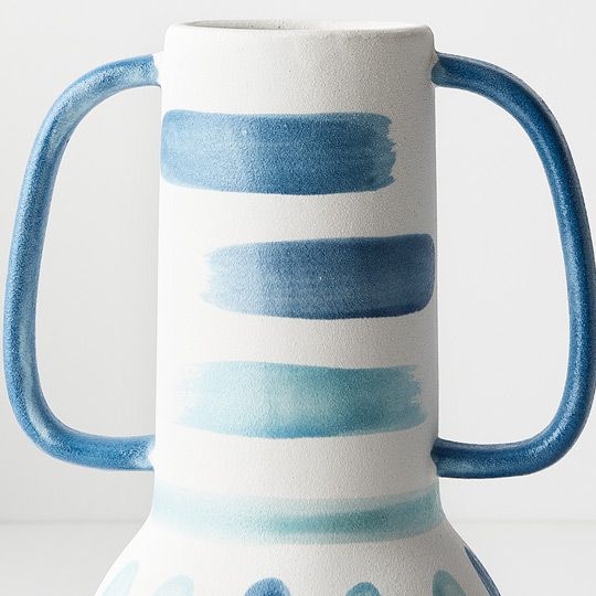 This ceramic vase naxos in blue white features a fun hand painted design with handles. Due to the nature of handmade items there may be slight variations in the size, surface texture, glaze consistency, colour or tone of the vase.