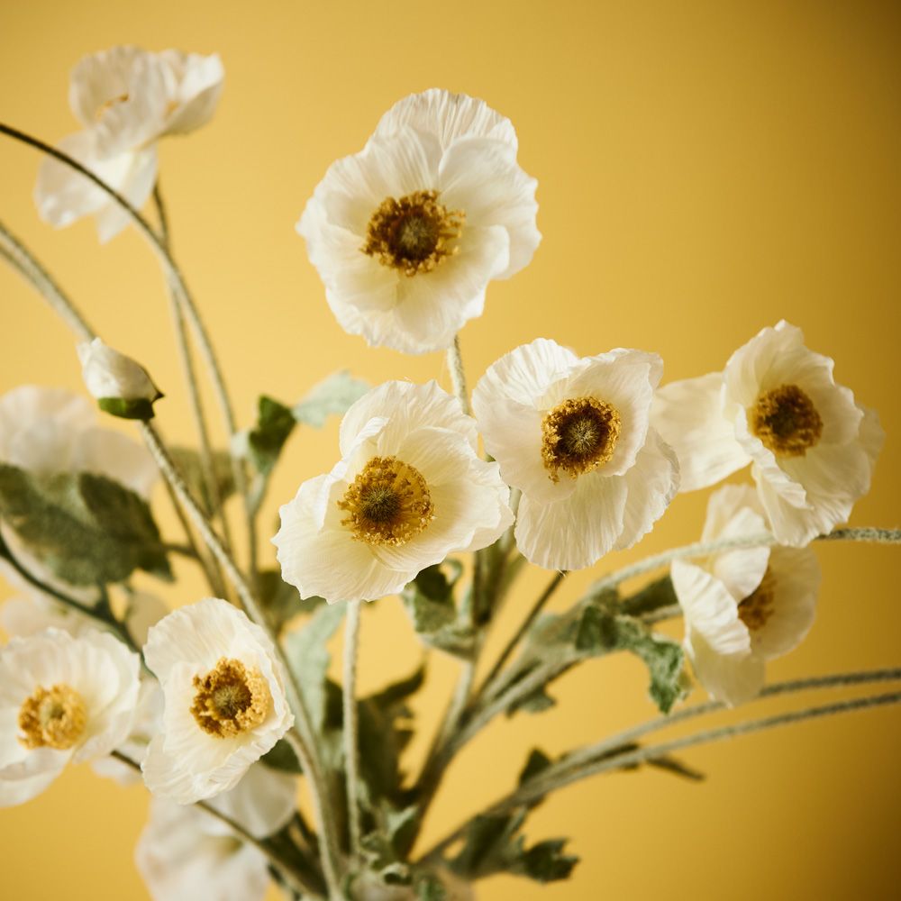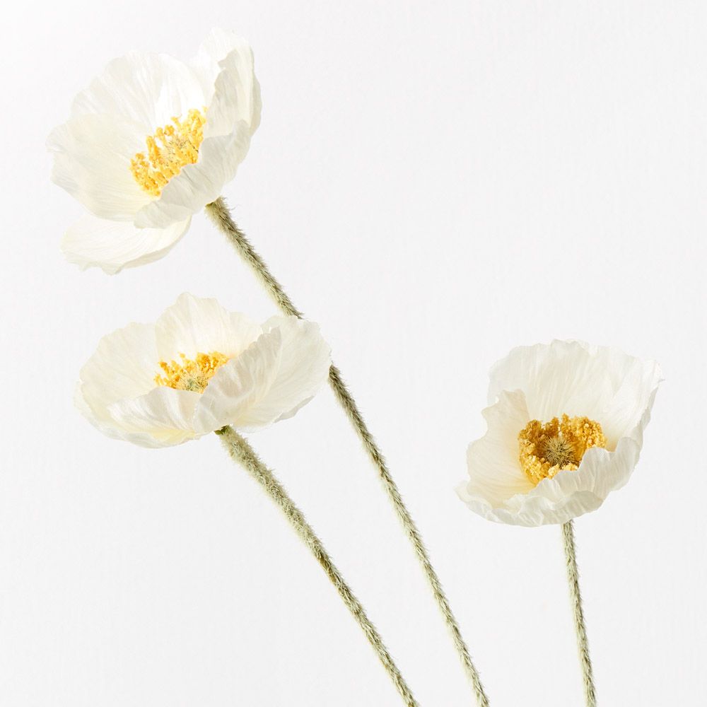 Bring a dash of colour to your interior space with this gorgeous faux poppy iceland spray in white. Easily maintained this beautiful artificial flower stem will bring lasting beauty into your home or interior space. Create a one of a kind artificial arrangement mixing this poppy spray with other stems or place in a decorative vase on its own. For longer lasting faux flower stems keep out of direct sunlight.