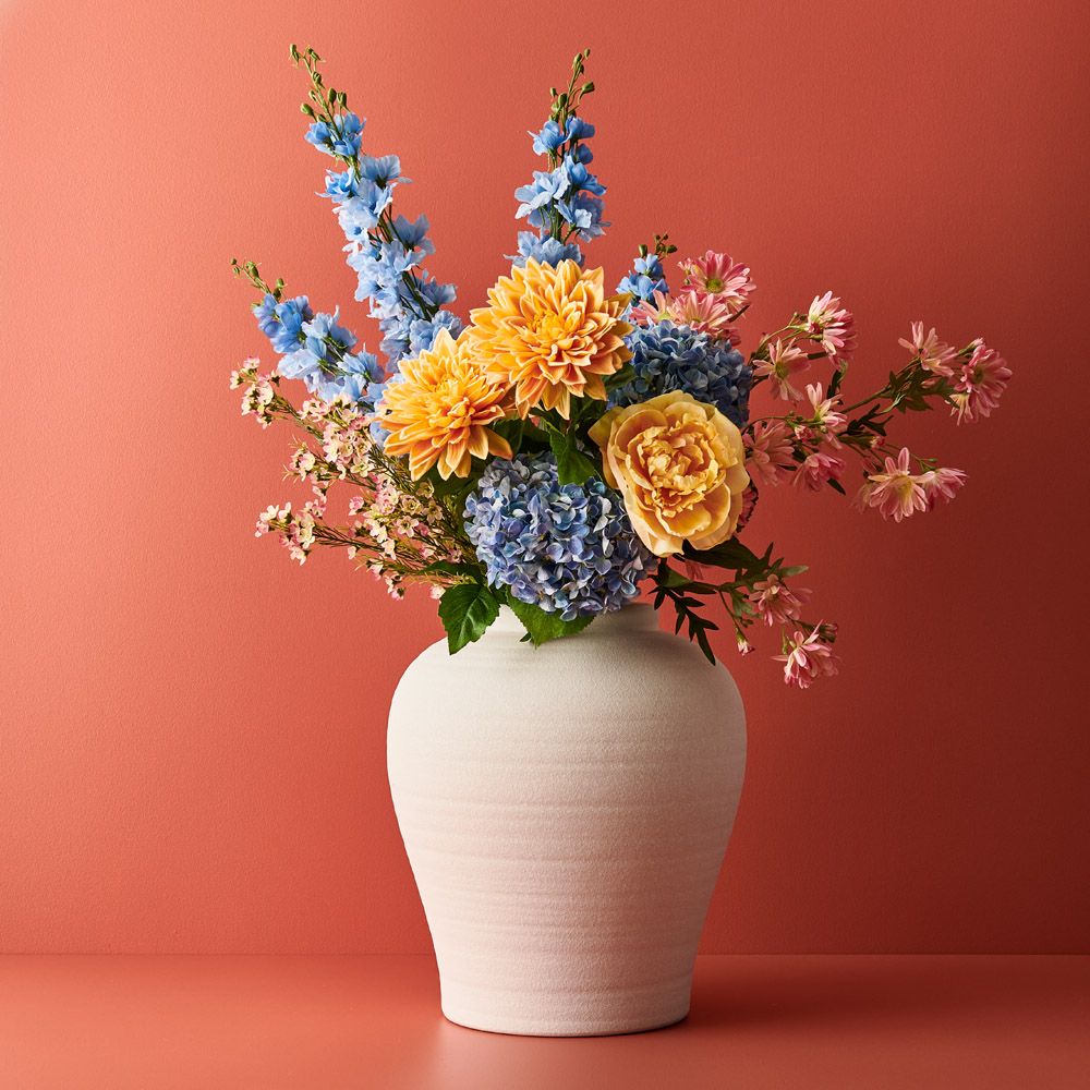 Bring warmth and vibrancy to your interior space with this gorgeous faux hydrangea in blue. Create a one of a kind artificial arrangement mixing with other stems or place in a decorative vase on its own. Being artificial, this flower stem will offer lasting beauty with minimal maintenance, keep out of direct sunlight.