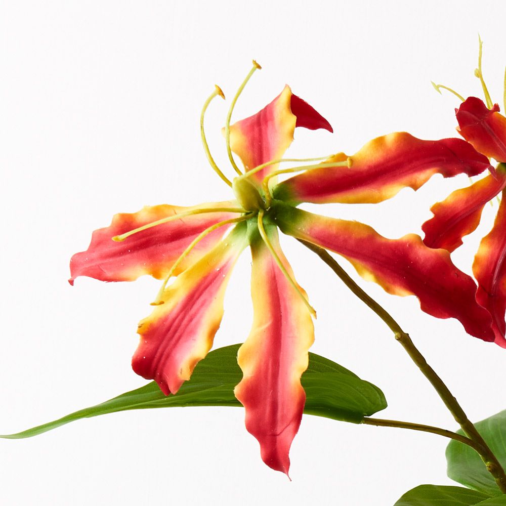 Brighten up your interior space with this striking faux lily gloriosa, unbelievably realistic with their vibrant petals you wouldn’t even think they’re faux! Style this artificial lily simply in a beautiful bunch on their own or create an arrangement from Floral Interiors huge variety of artificial flowers for impact. With minimal maintenance this faux stem can offer lasting beauty, keep out of direct sunlight. This artificial lily gloriosa spray is in our ‘Fresh Touch’ range which means the flower petals and heads have a realistic soft "feel", almost natural.