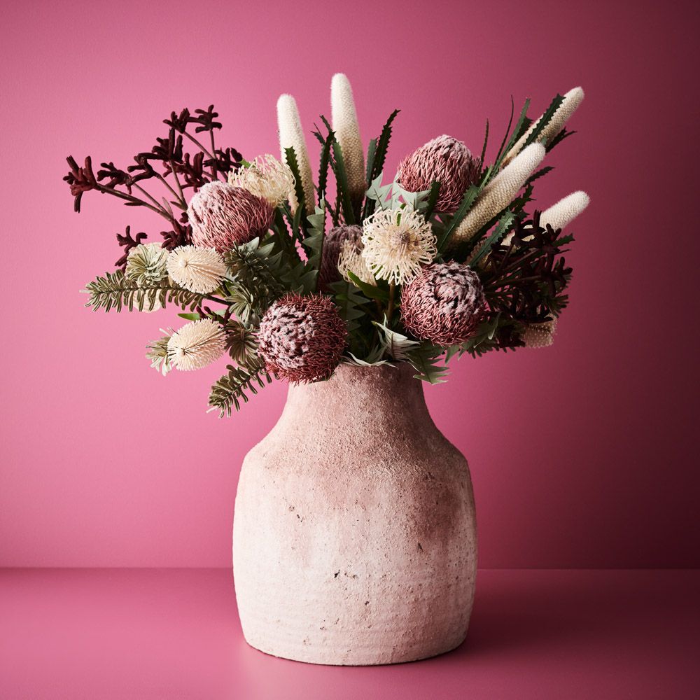 The artificial natives and in particular this Banksia Acorn in the floral interiors range are amazingly life-like. The fine details and colours are amazing, so true to life that it is difficult to note the difference. The faux Banksia Acorn in pink can easily be styled in a vase on its own or mixed with other artificial stems from our extensive range of natives. You can enjoy long lasting beauty with these faux stems with minimal maintenance be sure to keep out of direct sunlight.