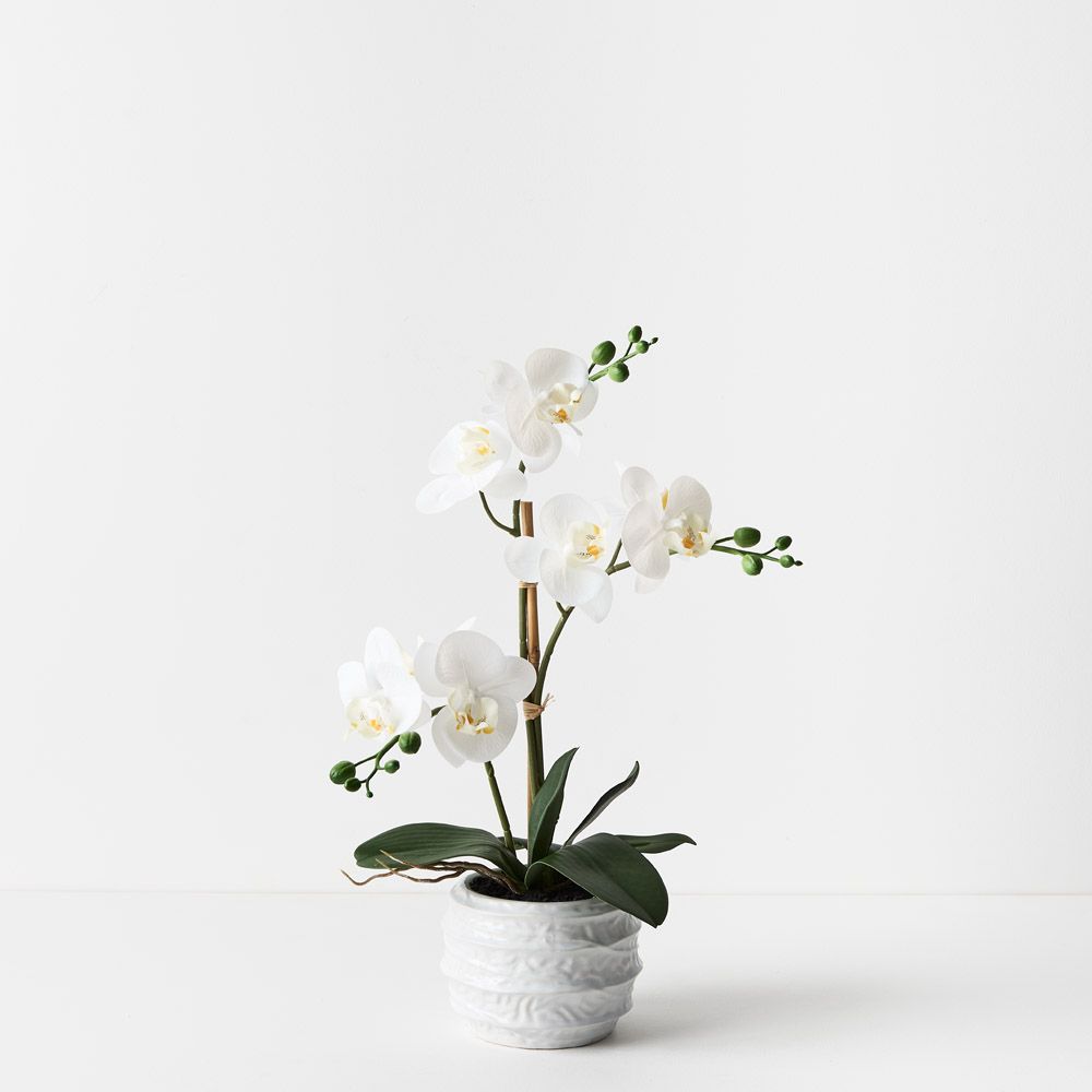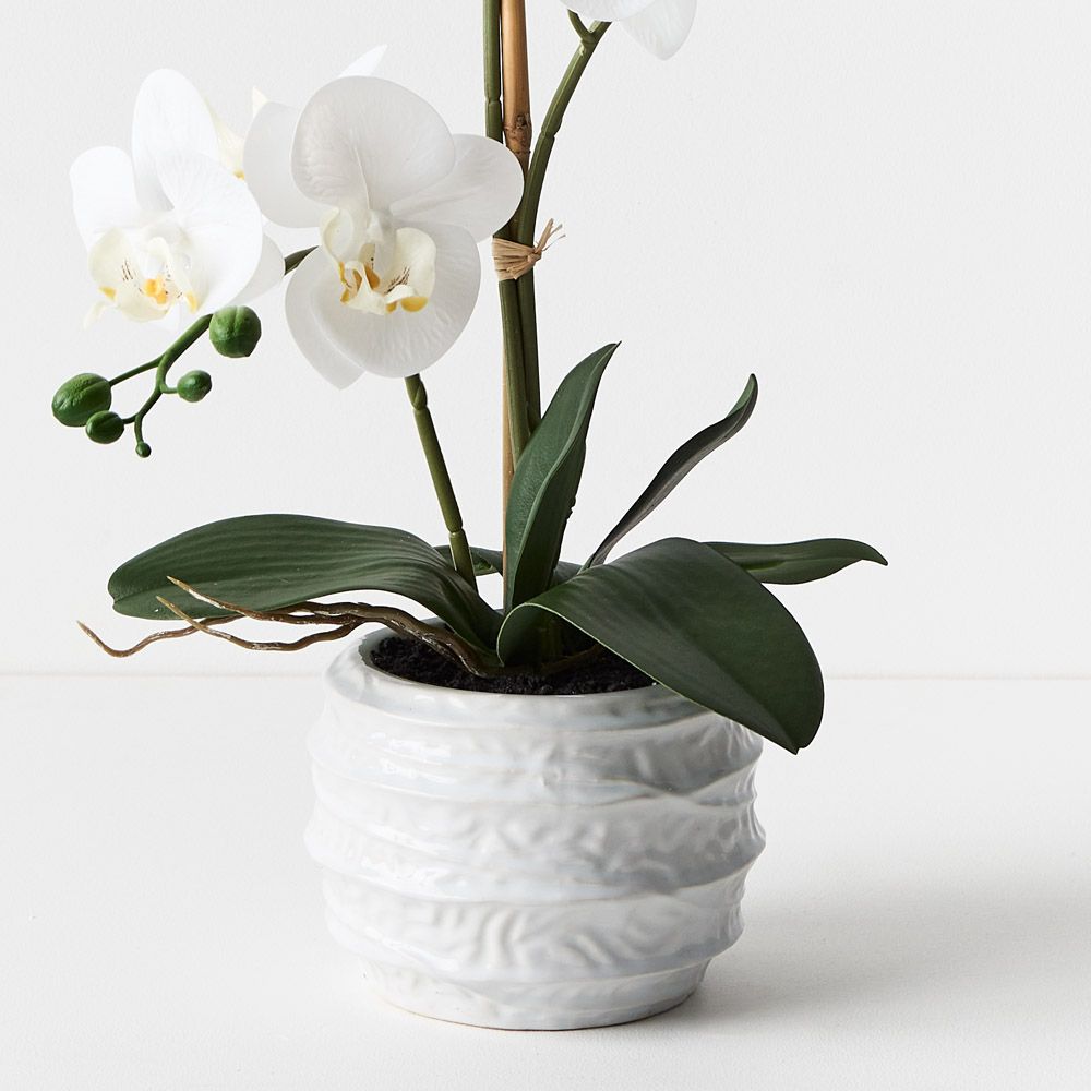 This artificial arrangement features its own stylish ceramic pot, patterned with a white glazed surface, ready to be styled in any space. This artificial orchid phalaenopsis in white is in our ‘Fresh Touch’ range which means the flower petals and leaves have a realistic soft "feel", almost natural.