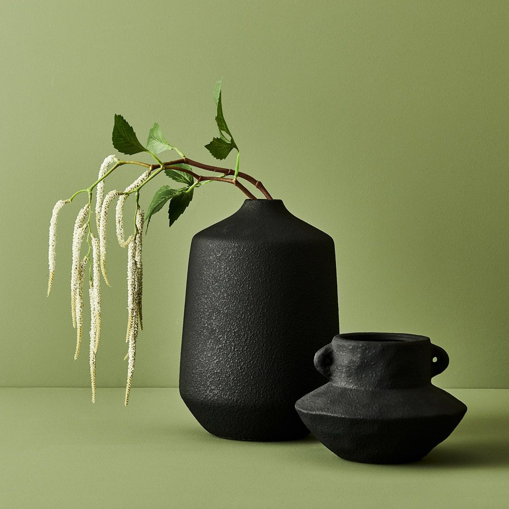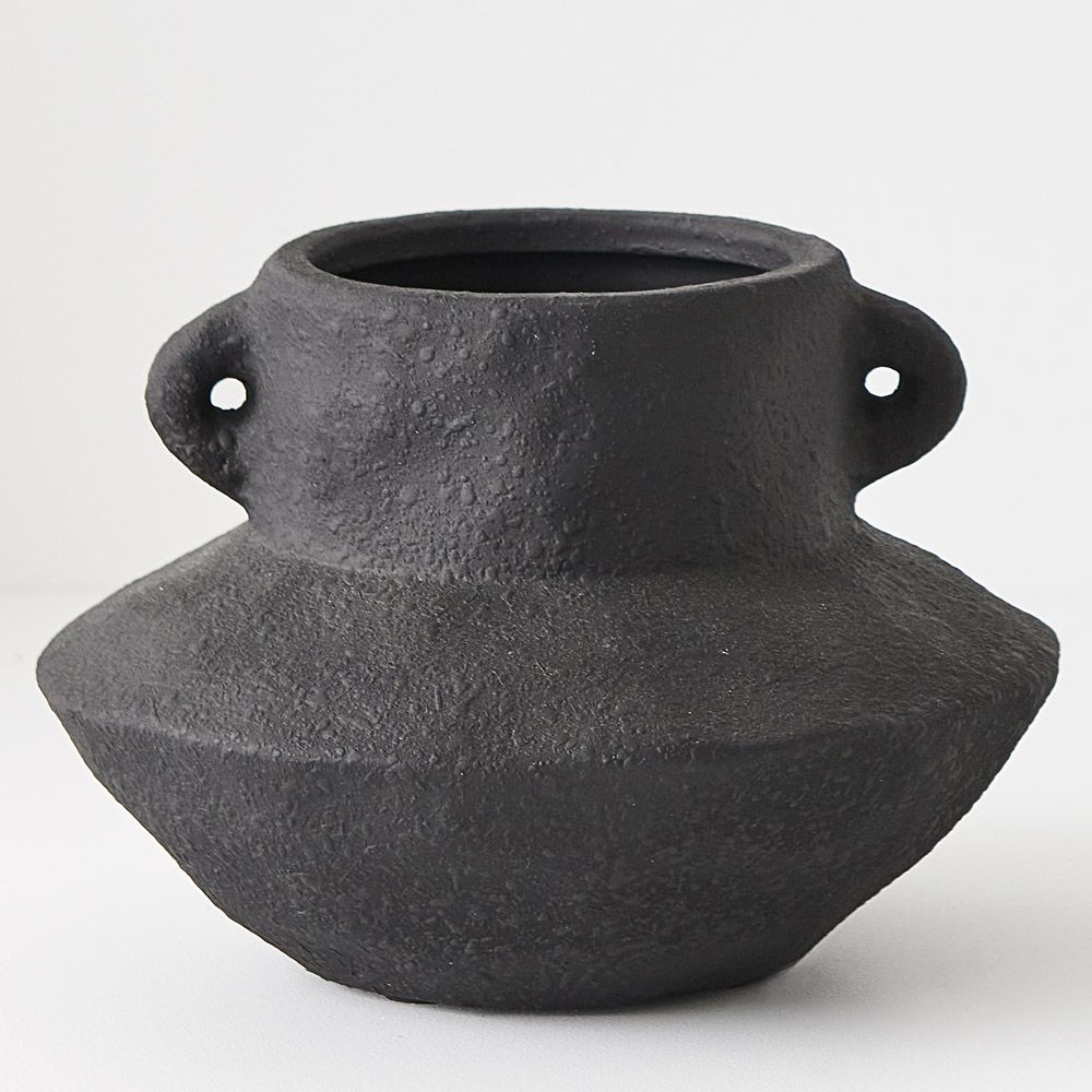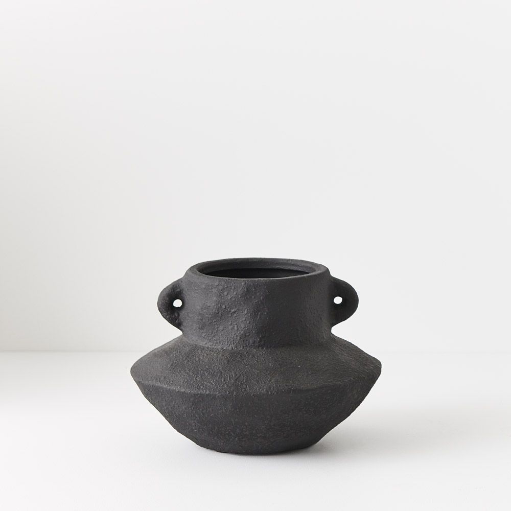 The Idaka ceramic pot in black is small piece with a textured surface that adds to its unique charm. Perfectly styles along or with the larger Idaka pieces. As with all handmade items, you can anticipate subtle variations in size, surface texture, glaze consistency, colour, and tone. This small pot is ideally suited for indoor decor, but it's essential to note that it does not come with a drainage hole. Note: These decorative vases do not come with a guarantee they will hold water.