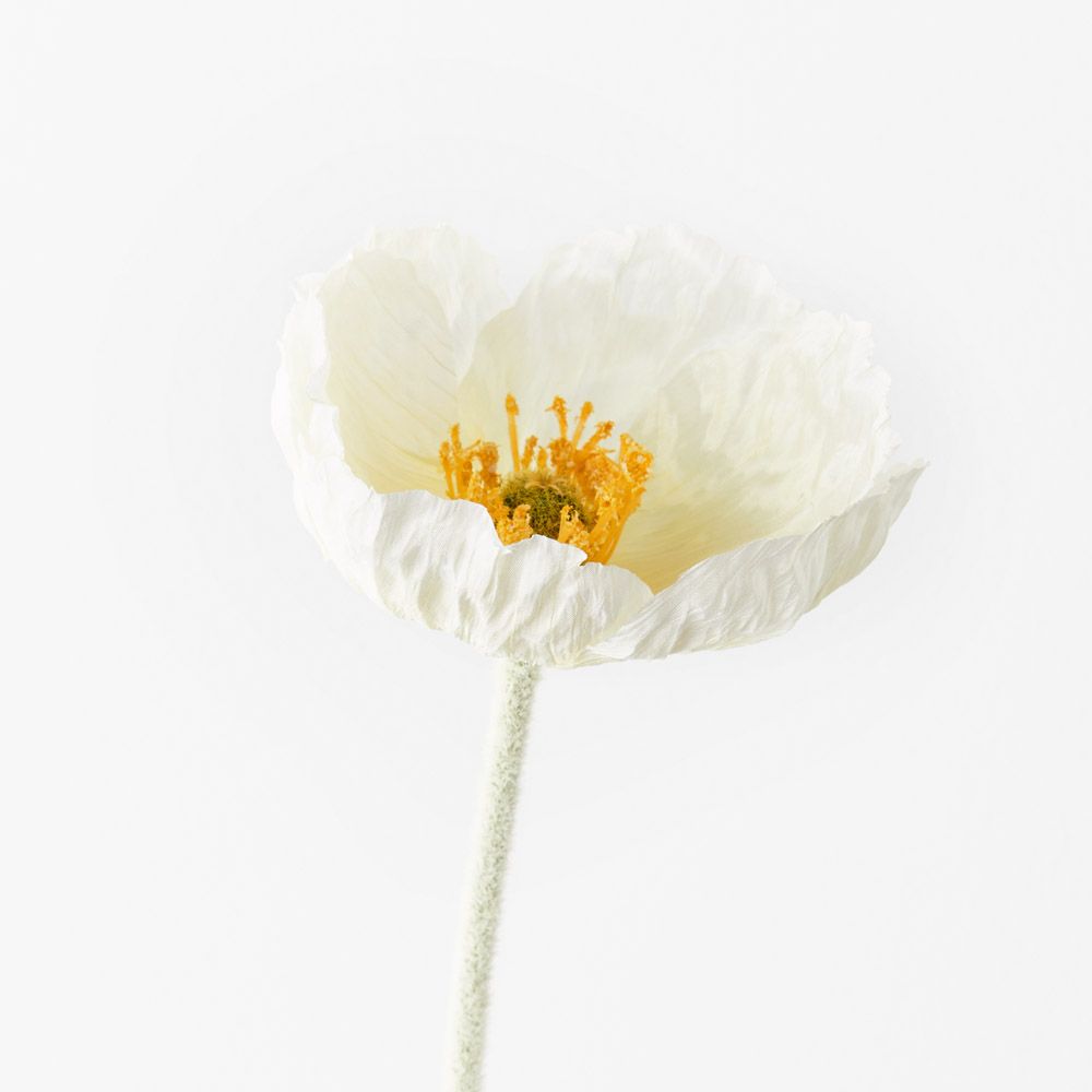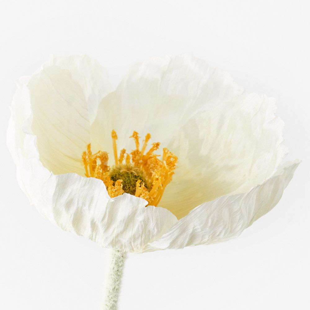 Bring a dash of colour to your interior space with this gorgeous faux poppy iceland in white. Easily maintained this beautiful artificial flower stem will bring lasting beauty into your home or interior space. Create a one of a kind artificial arrangement mixing this poppy with other stems or place in a decorative vase on its own. For longer lasting faux flower stems keep out of direct sunlight.