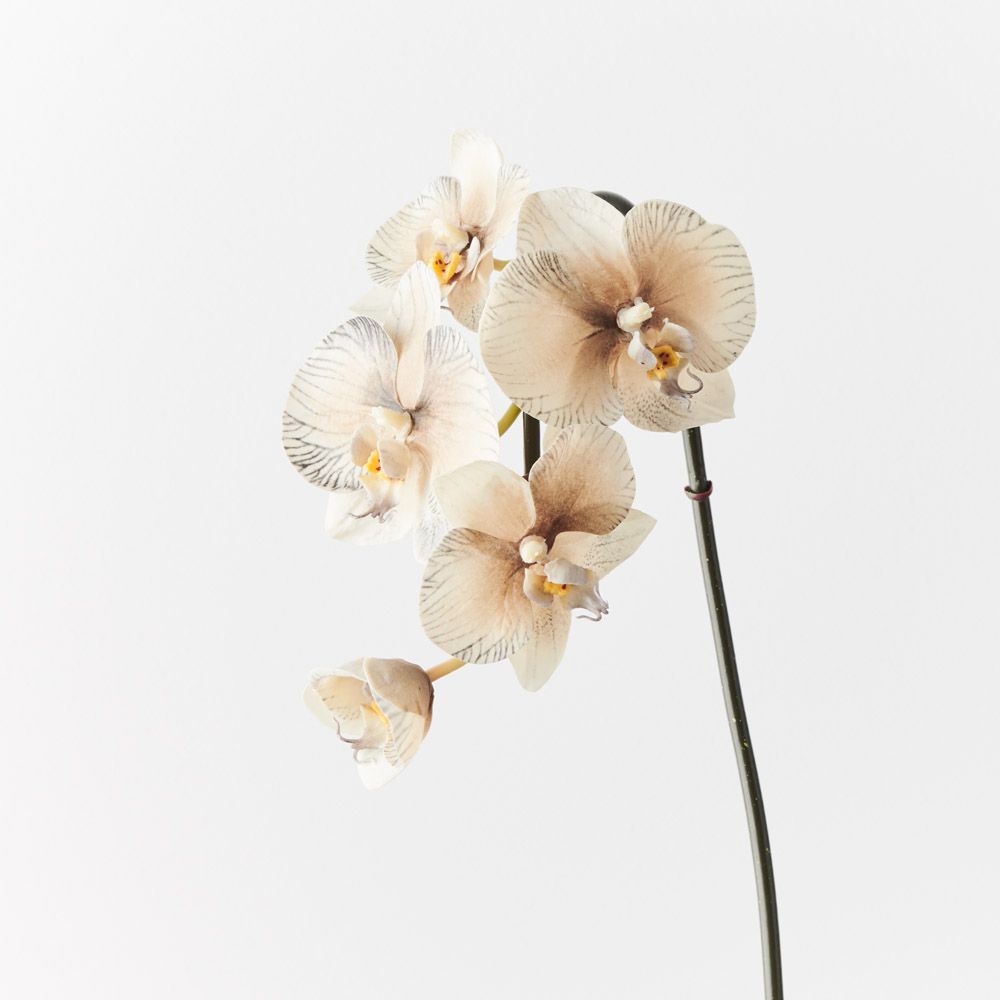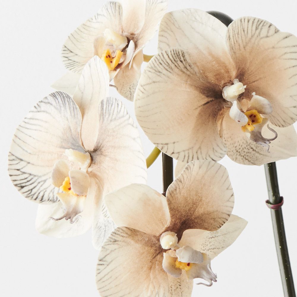 Bring a dash of colour to your interior space with this gorgeous faux Orchid Phalaenopsis Infused Mini stem in almond. Easily maintained this incredibly realistic artificial flower stem will bring lasting beauty into your home. Create a one of a kind artificial arrangement mixing with other stems or place in a decorative vase on its own. For longer lasting faux flower stems keep out of direct sunlight. This artificial Orchid Phalaenopsis is in our ‘Fresh Touch’ range which means the flower petals and heads have a realistic soft "feel", almost natural.