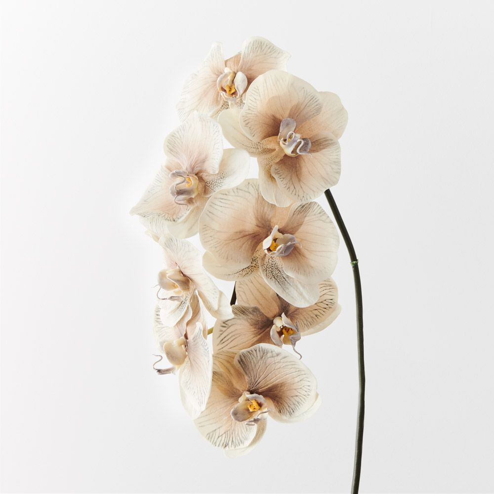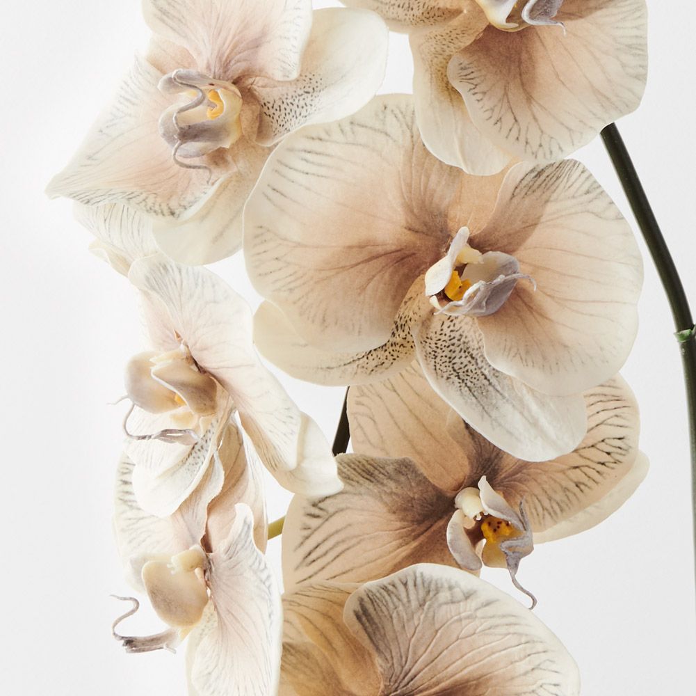 Bring a dash of colour to your interior space with this gorgeous faux Orchid Phalaenopsis Infused stem in almond. Easily maintained this incredibly realistic artificial flower stem will bring lasting beauty into your home. Create a one of a kind artificial arrangement mixing with other stems or place in a decorative vase on its own. For longer lasting faux flower stems keep out of direct sunlight. This artificial Orchid Phalaenopsis is in our ‘Fresh Touch’ range which means the flower petals and heads have a realistic soft "feel", almost natural.