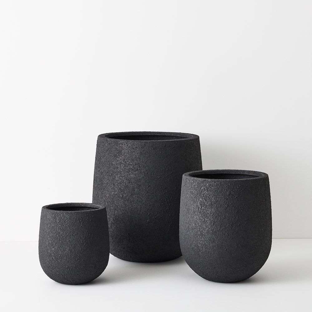 Our pot rok tora (set of 3) in black are the perfect modern vessel to style your plants in any space. These pots are handmade from polystone, due to the nature of handmade items there may be slight variations in the size, surface texture or colour. Suitable for indoor or outdoor use they all come with a drainage hole.