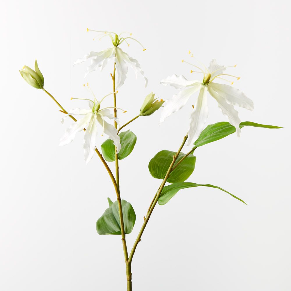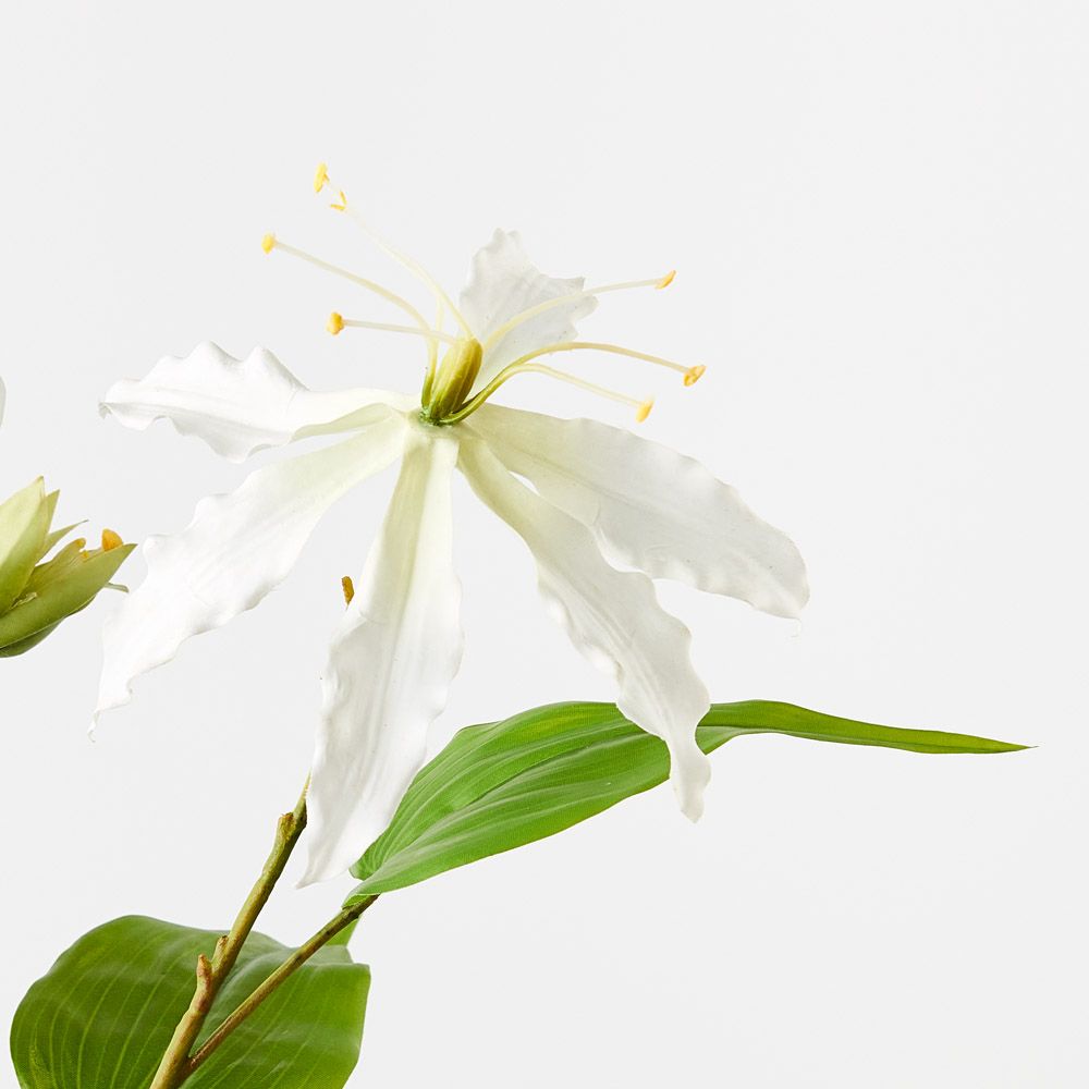 Brighten up your interior space with this striking faux lily gloriosa in white, unbelievably realistic with their vibrant petals you wouldn’t even think they’re faux! Style this artificial lily simply in a beautiful bunch on their own or create an arrangement from Floral Interiors huge variety of artificial flowers for impact. With minimal maintenance this faux stem can offer lasting beauty, keep out of direct sunlight. This artificial lily gloriosa spray is in our ‘Fresh Touch’ range which means the flower petals and heads have a realistic soft "feel", almost natural.