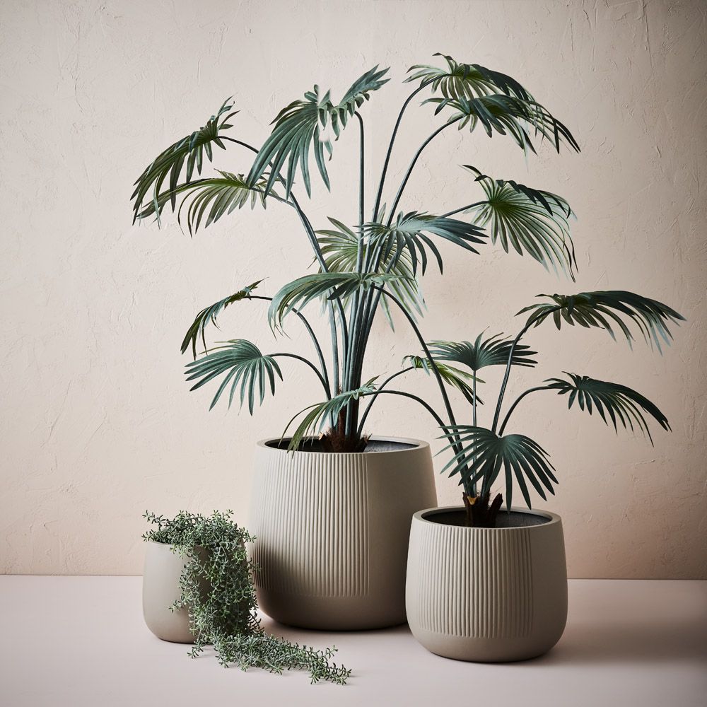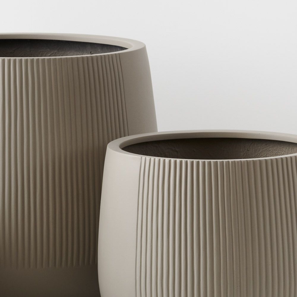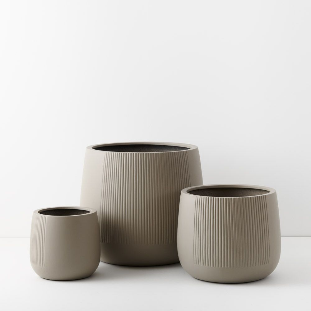 Dune Pedro pots come in a set of three. They feature a linear pattern on a section of the exterior. Their egg-shaped design harmonises indoor and outdoor spaces, offering versatility and style for nurturing plants in any environment. These pots have drainage holes and are a lightweight polystone.