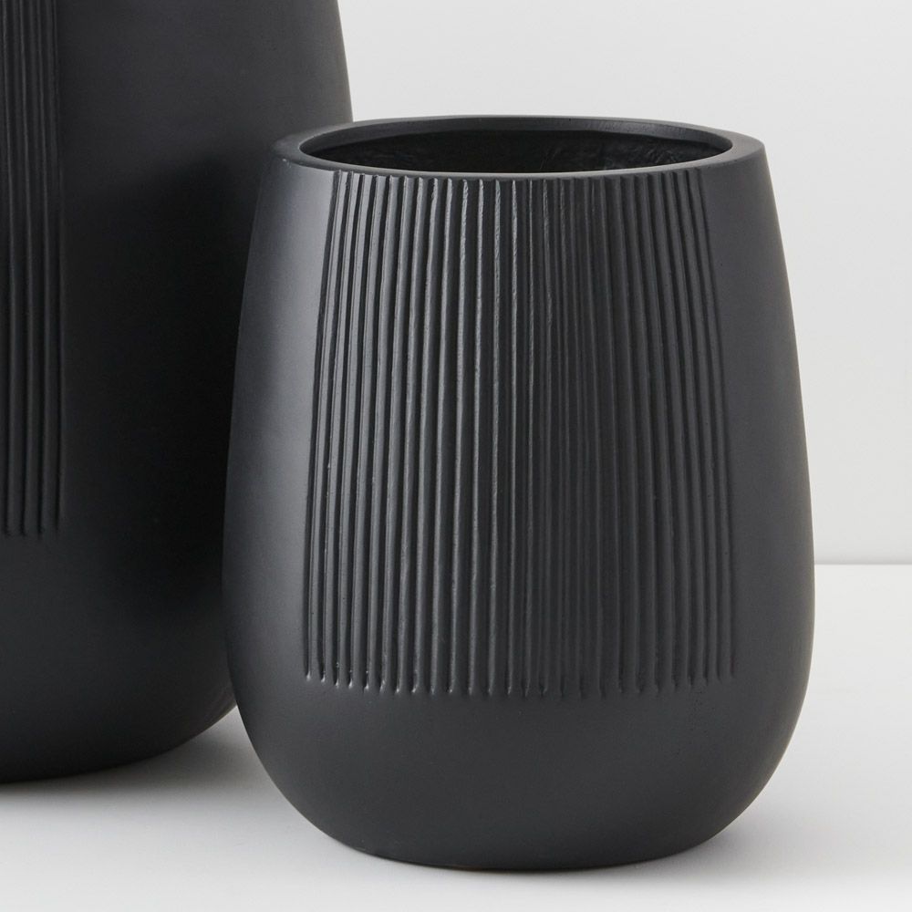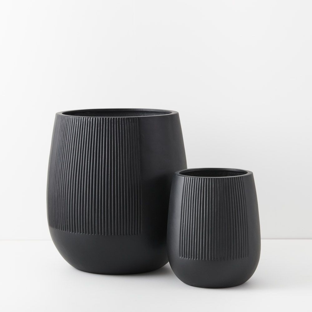 Introducing Dune Jethro Pots: A striking duo of oversized pots designed to house large plants with flair. Featuring the signature linear pattern, these statement pieces elevate interior spaces, blending functionality with eye-catching aesthetics for botanical enthusiasts seeking bold elegance. These pots have drainage holes and are a lightweight polystone.
