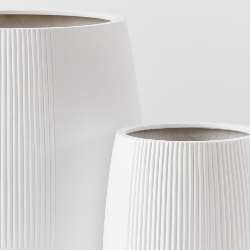 Introducing Dune Jethro Pots: A striking duo of oversized pots designed to house large plants with flair. Featuring the signature linear pattern, these statement pieces elevate interior spaces, blending functionality with eye-catching aesthetics for botanical enthusiasts seeking bold elegance. These pots have drainage holes and are a lightweight polystone.