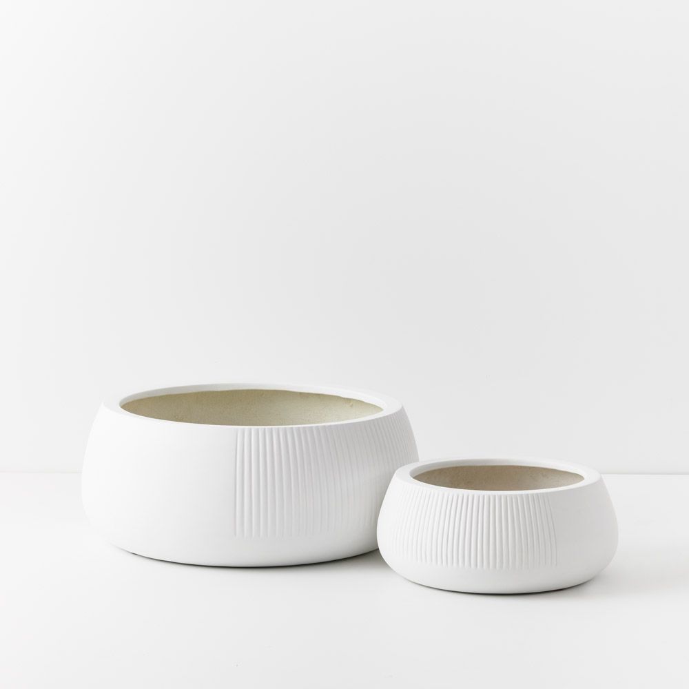 Meet Dune Nejalo: A duo of low bowl like pots, ideal for succulents, hanging plants and greenery. These pots are perfect for smaller plants, whether indoors or outdoors. Elevate your space with their sleek design and versatility. These pots have drainage holes and are a lightweight polystone.