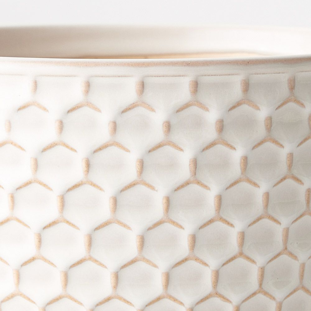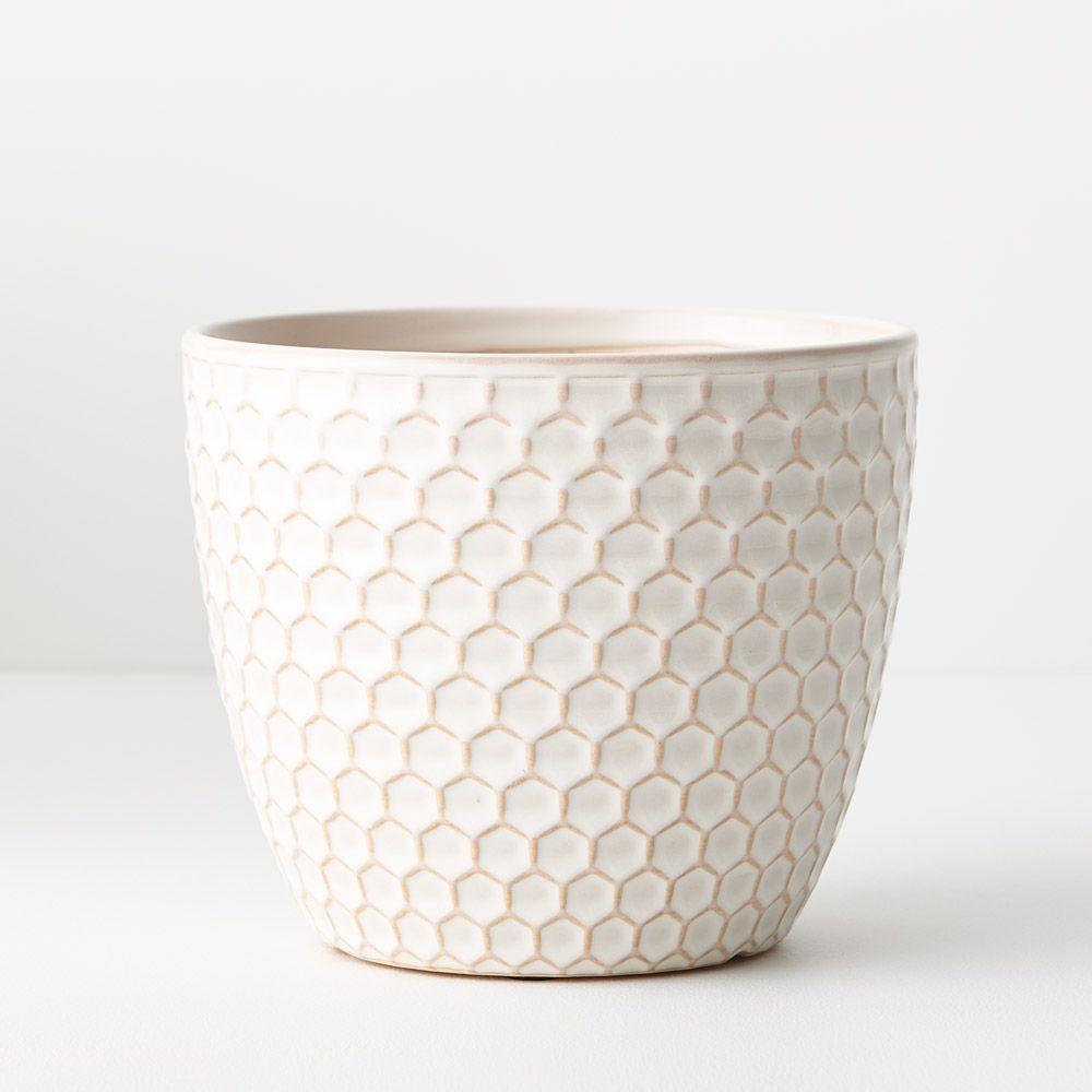 Introducing the Pot Hunee, a delightful blend of cream and tan with a charming honeycomb pattern. This stylish pot adds a touch of contemporary elegance to any space, offering a perfect balance of modern design and timeless appeal.
