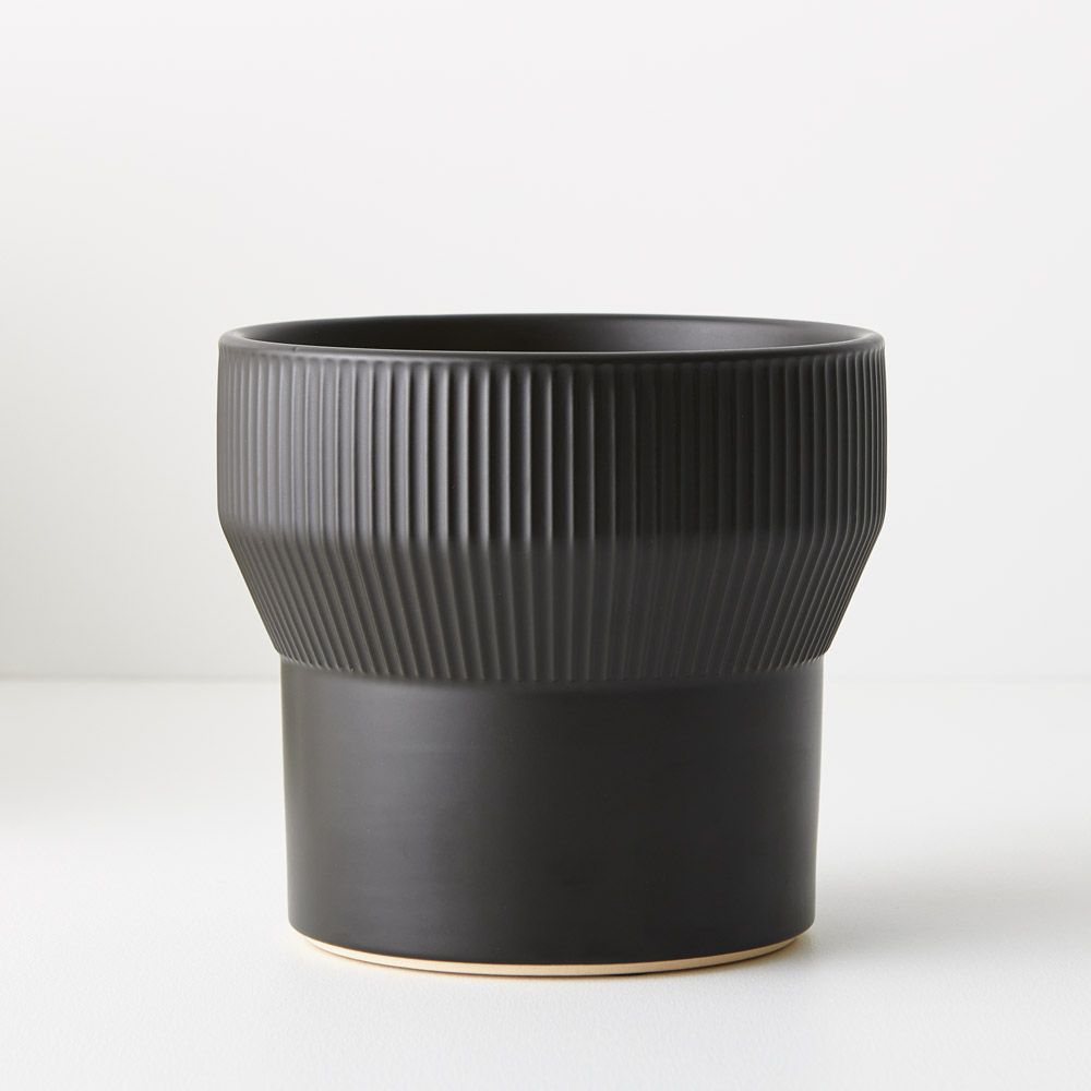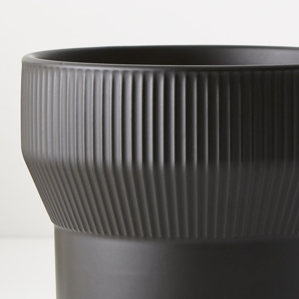The 16cm Nalo Pot in black boasts a chic ribbed detail at the top, adding texture and charm to any space. Its minimalist design complements various decor styles, making it an ideal vessel for small plants or stylish accents.