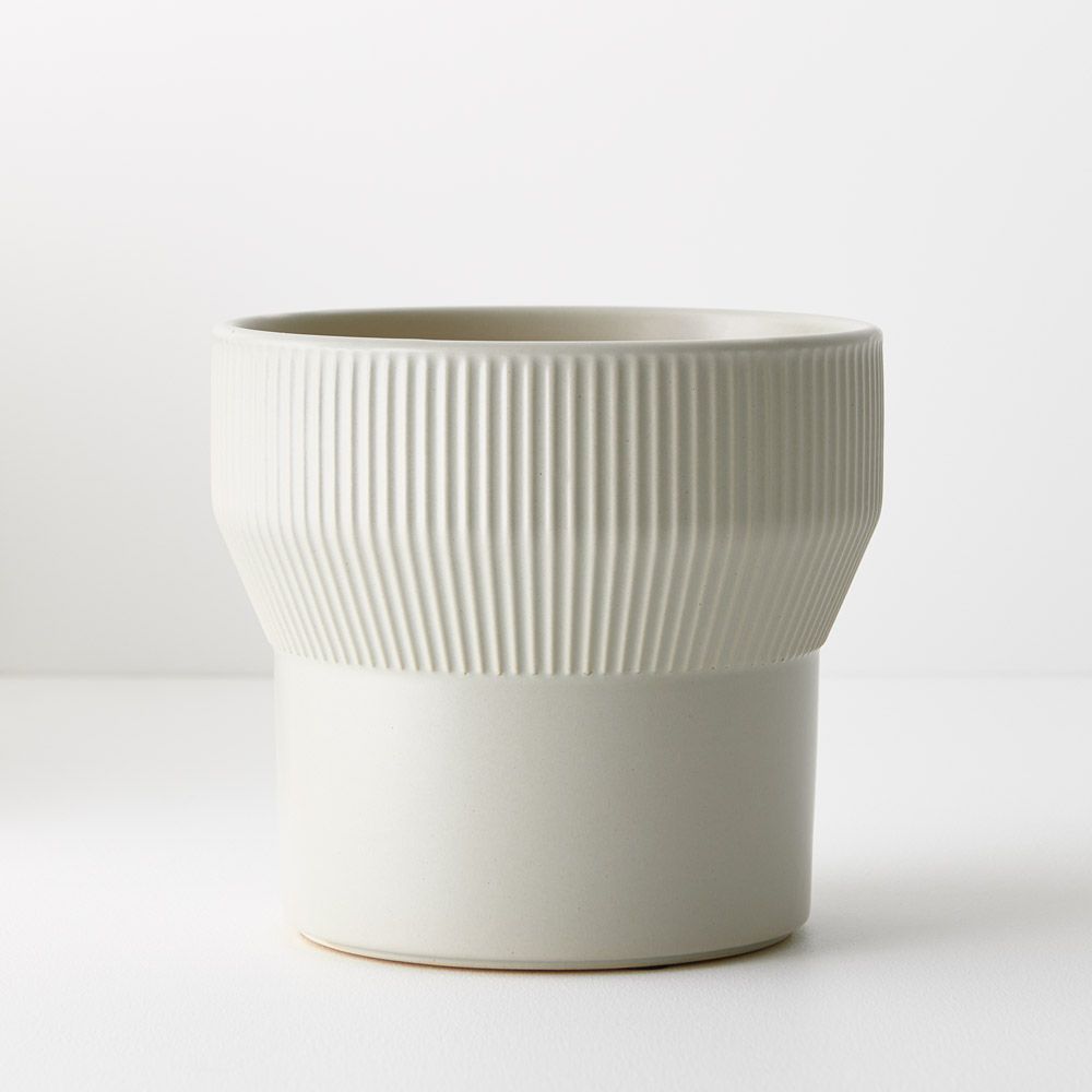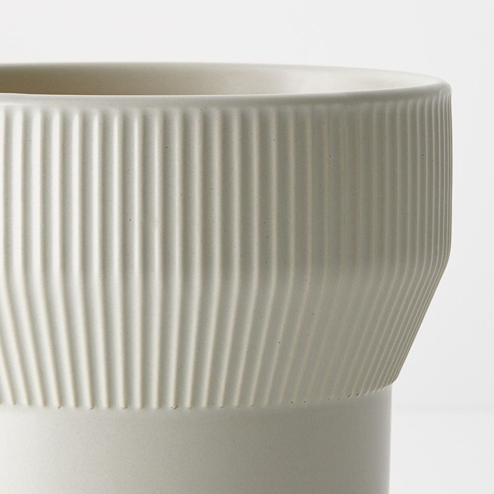 The 16cm Nalo Pot in grey boasts a chic ribbed detail at the top, adding texture and charm to any space. Its minimalist design complements various decor styles, making it an ideal vessel for small plants or stylish accents.