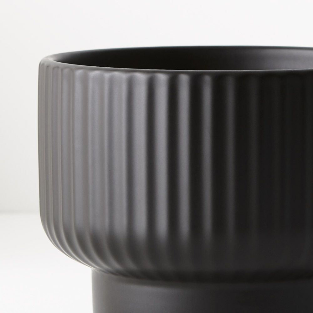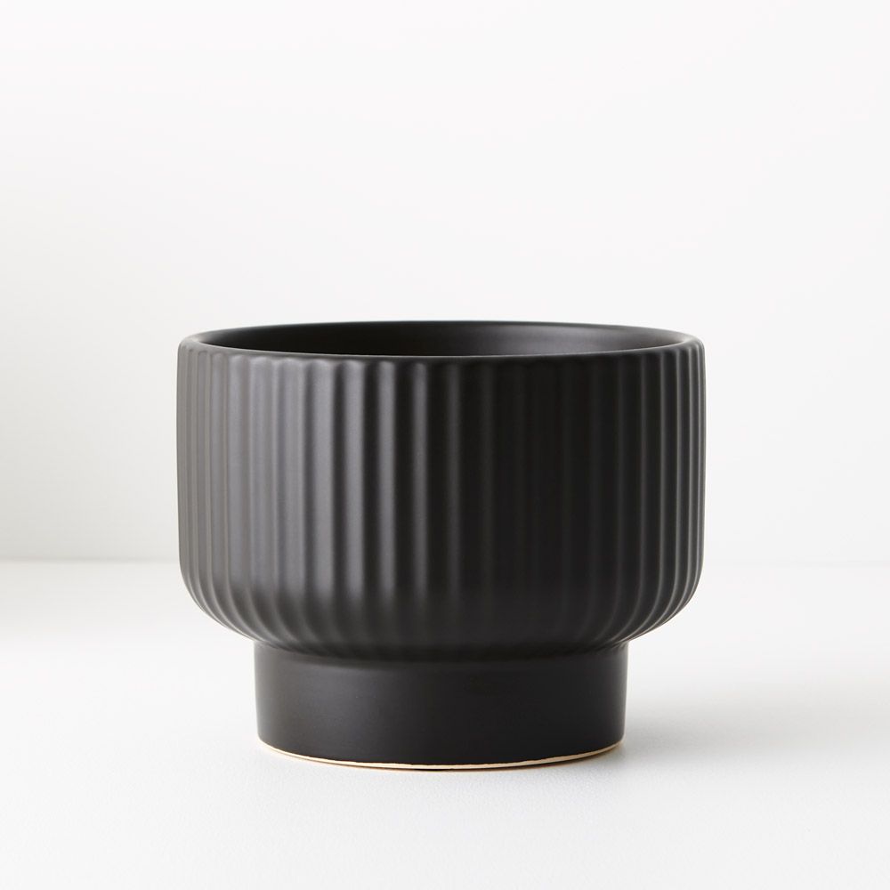The 16cm Silke Pot, adorned in black, features intricate lined detailing, elevating its visual appeal with sophistication. Its minimalist allure and textured design make it perfect for displaying plants or enhancing any space as a standalone decorative accent.