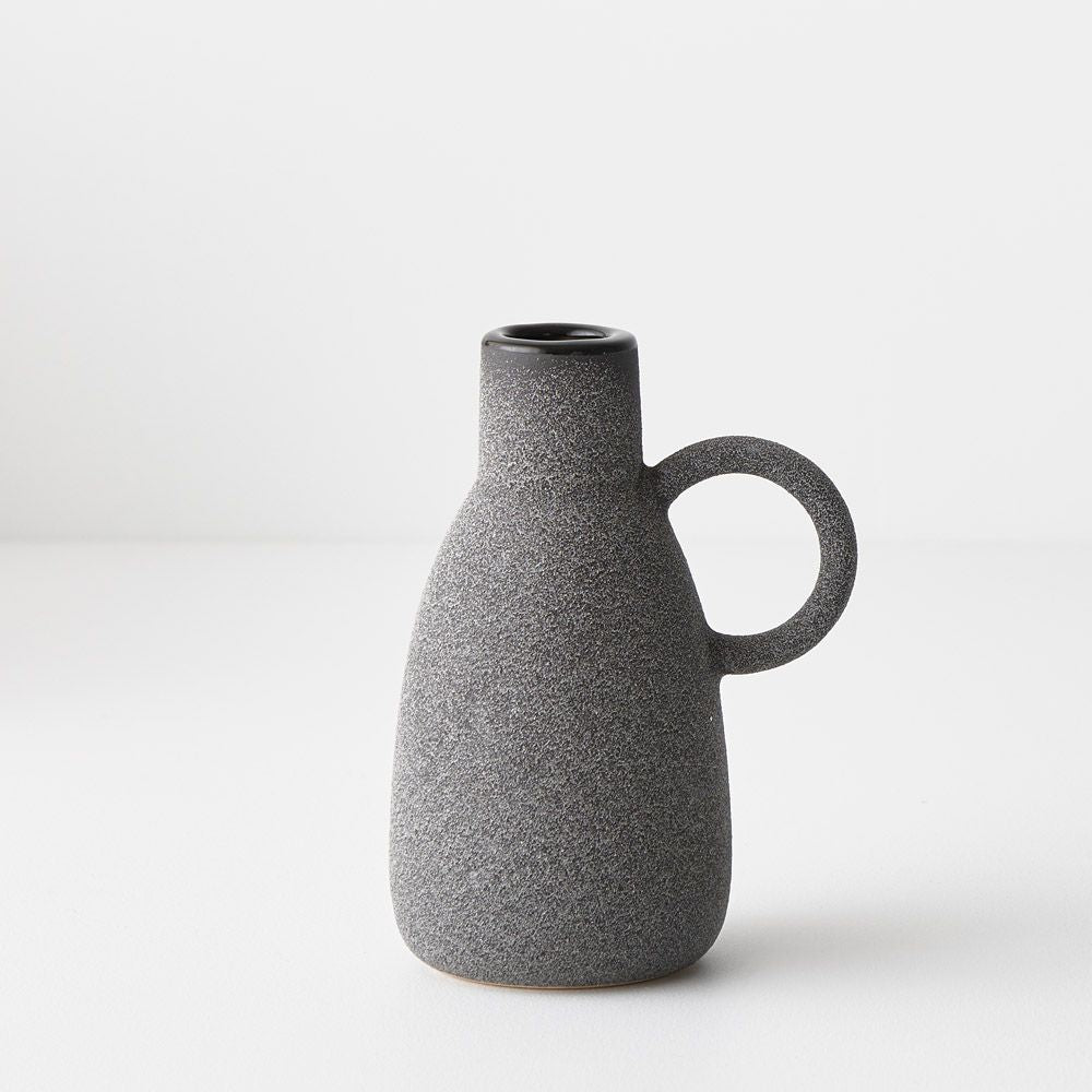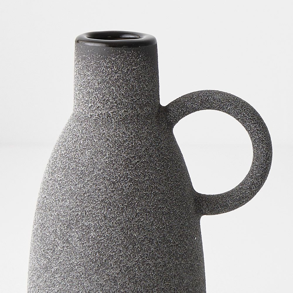 The Pilu Vase with handle showcases a charming, speckled finish, adding rustic elegance to its design. With its graceful handle and textured surface, it exudes a quaint charm, perfect for displaying a floral stem or as a standalone decorative accent, infusing spaces with timeless appeal. Note: These decorative vases do not come with a guarantee they will hold water.