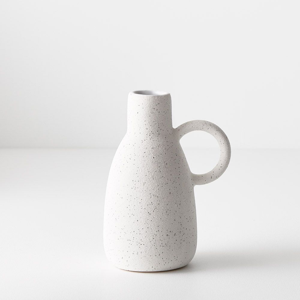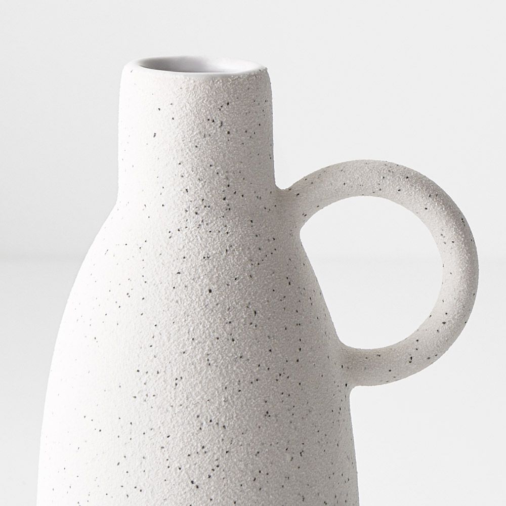 The Pilu Vase with handle showcases a charming, speckled finish, adding rustic elegance to its design. With its graceful handle and textured surface, it exudes a quaint charm, perfect for displaying a floral stem or as a standalone decorative accent, infusing spaces with timeless appeal. Note: These decorative vases do not come with a guarantee they will hold water.