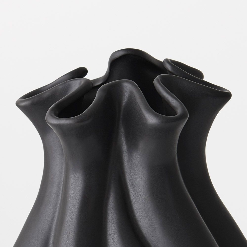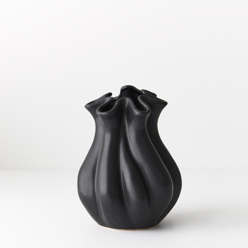 Our Annabella Vase in Black boasts a stunning design that appears almost twisted, offering a captivating statement piece for floral arrangements or decorative use. Its unique form adds an artistic touch, making it an exquisite addition to any space, whether showcasing blooms or standing alone as a symbol of elegance and style.