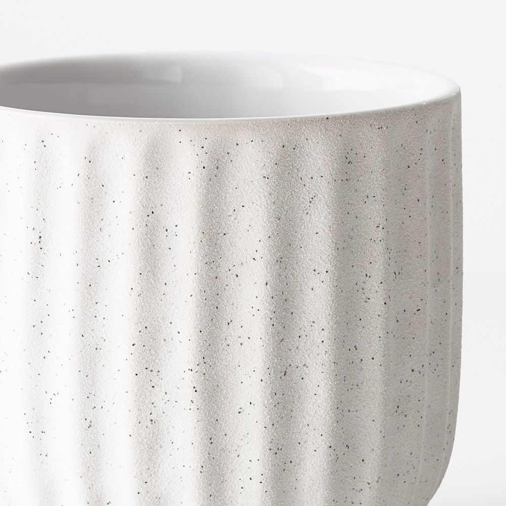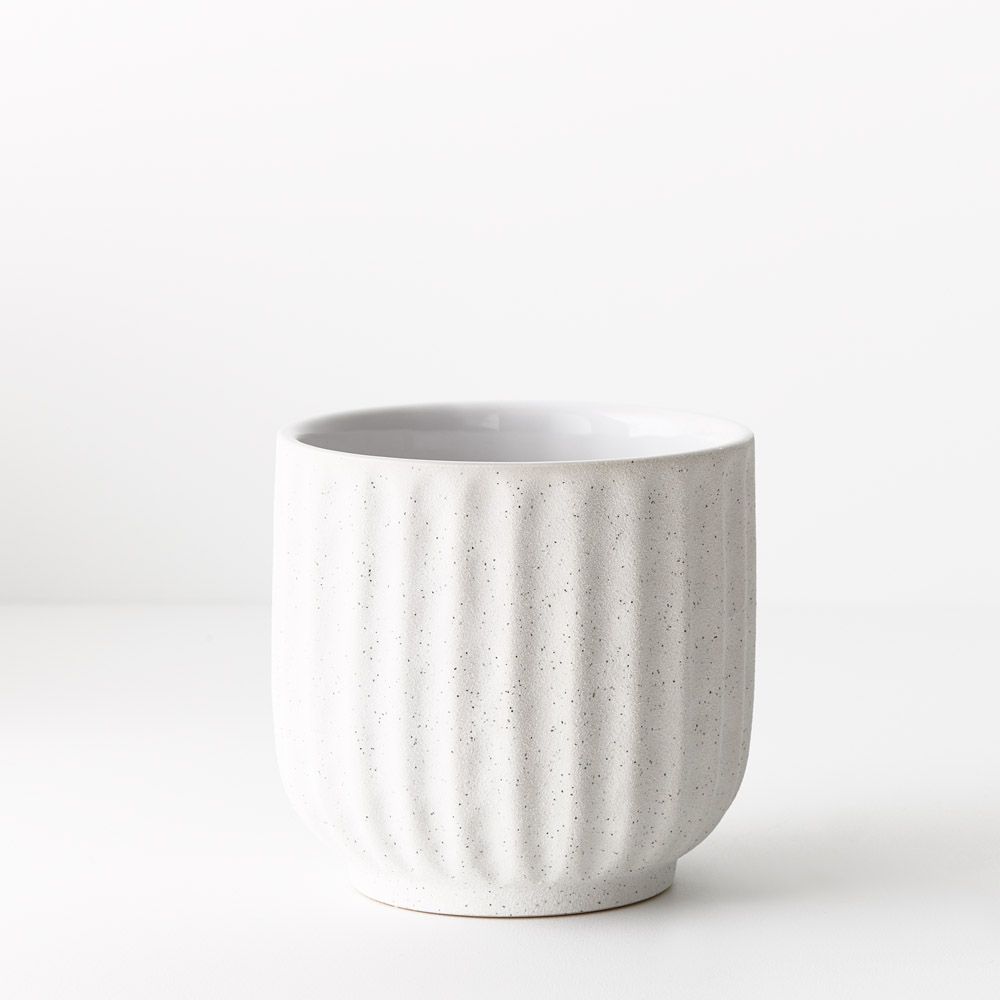 The Pilu Pot in white, measuring 13.5cm, showcases a distinct grooved design that adds texture and visual interest to its appearance. Its sleek yet eye-catching style makes it a versatile choice for housing plants or enhancing decor arrangements with a touch of modern flair.