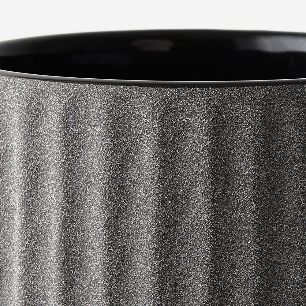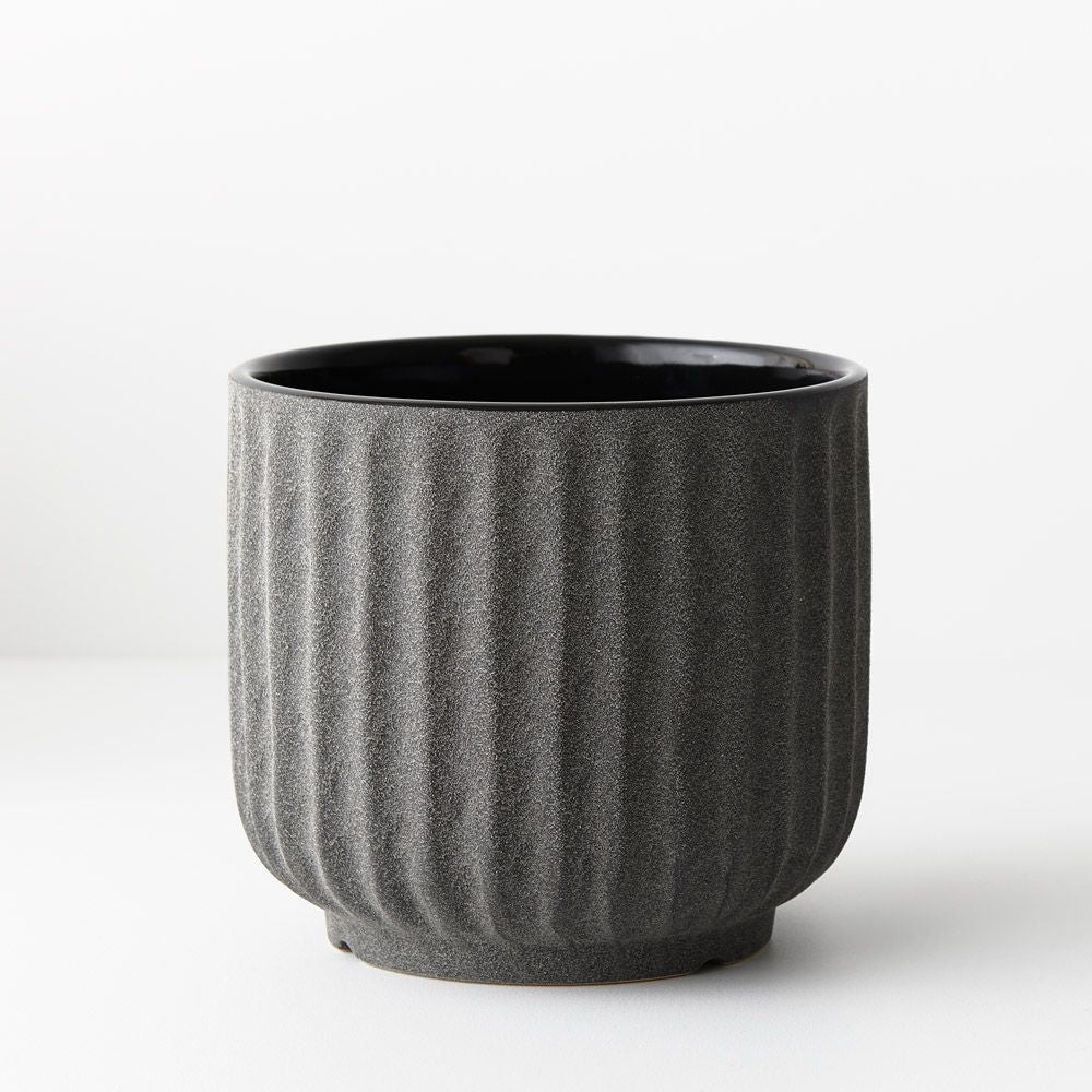 The Pilu Pot in black, measuring approx 17cm, showcases a distinct grooved design that adds texture and visual interest to its appearance. Its sleek yet eye-catching style makes it a versatile choice for housing plants or enhancing decor arrangements with a touch of modern flair.